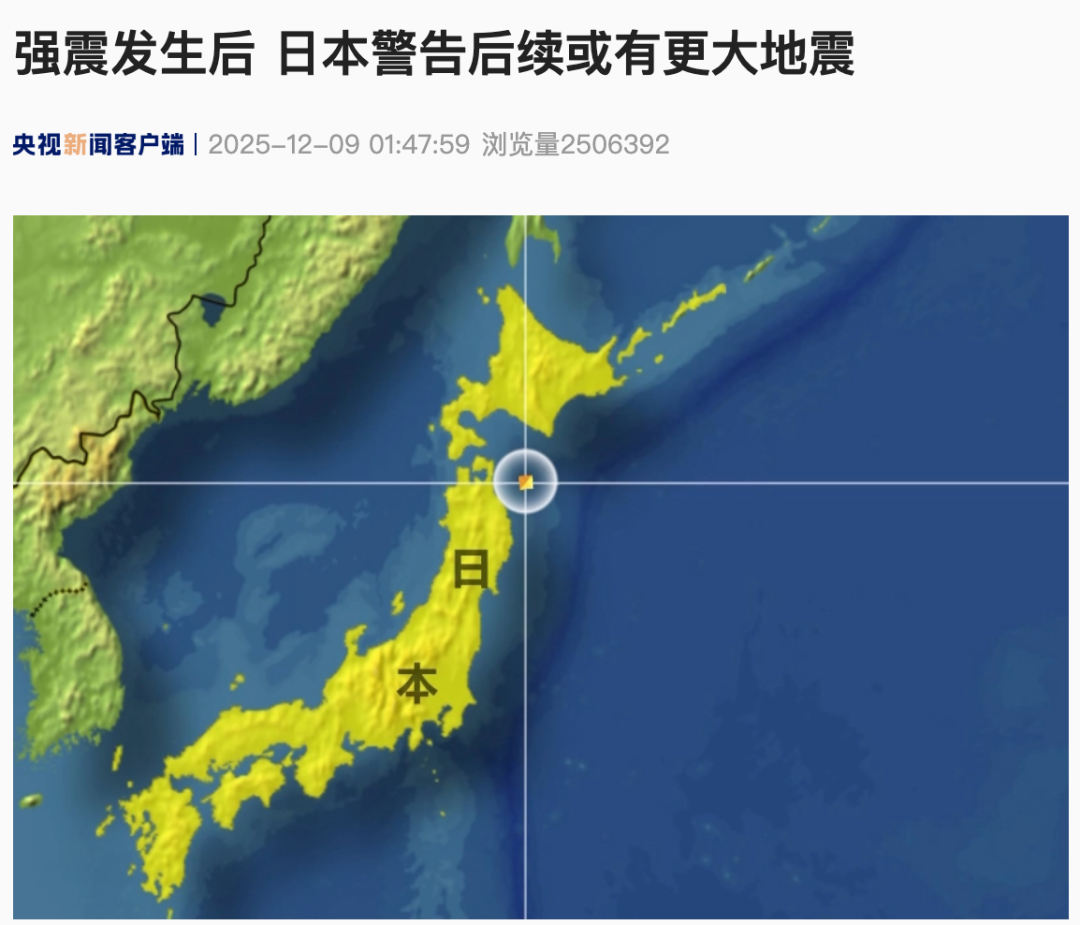 12月8日深夜日本本州东部近海发生强烈地震后,日本气象厅于当地时间9日凌晨2时发布了“北海道·三陆冲后续地震注意信息”——由于千岛海沟和日本海沟沿线地区发生巨大地震的可能性比平时相对升高,日本内阁与气象厅呼吁民众根据政府和地方自治体的指示,采取防灾应对措施。据悉,这是自2022年12月开始运用该信息制度以来,首次发布“北海道·三陆冲后续地震注意信息”。