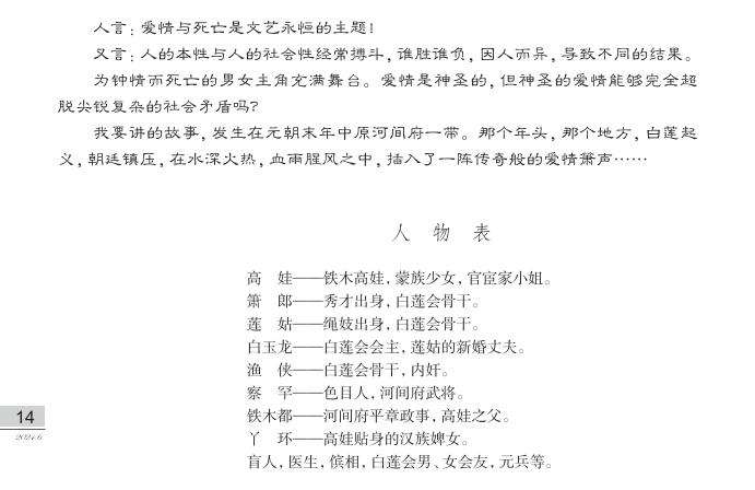 “我要讲的故事,发生在元朝末年中原河间府一带。那个年头,那个地方,白莲起义,朝廷镇压,在水深火热,血雨腥风之中,插入了一阵传奇般的爱情箫声……”《铁木高娃》延续了魏明伦擅长的悲剧性,将个人情感置于社会矛盾中,讲述乱世中爱情的撕裂与挣扎。元末河间府白莲教起义,少女高娃偶遇白莲会才子箫郎,二人相爱,但身份有别、势力相对,一场跨越阶级的爱情在重重矛盾中以悲剧收场。
