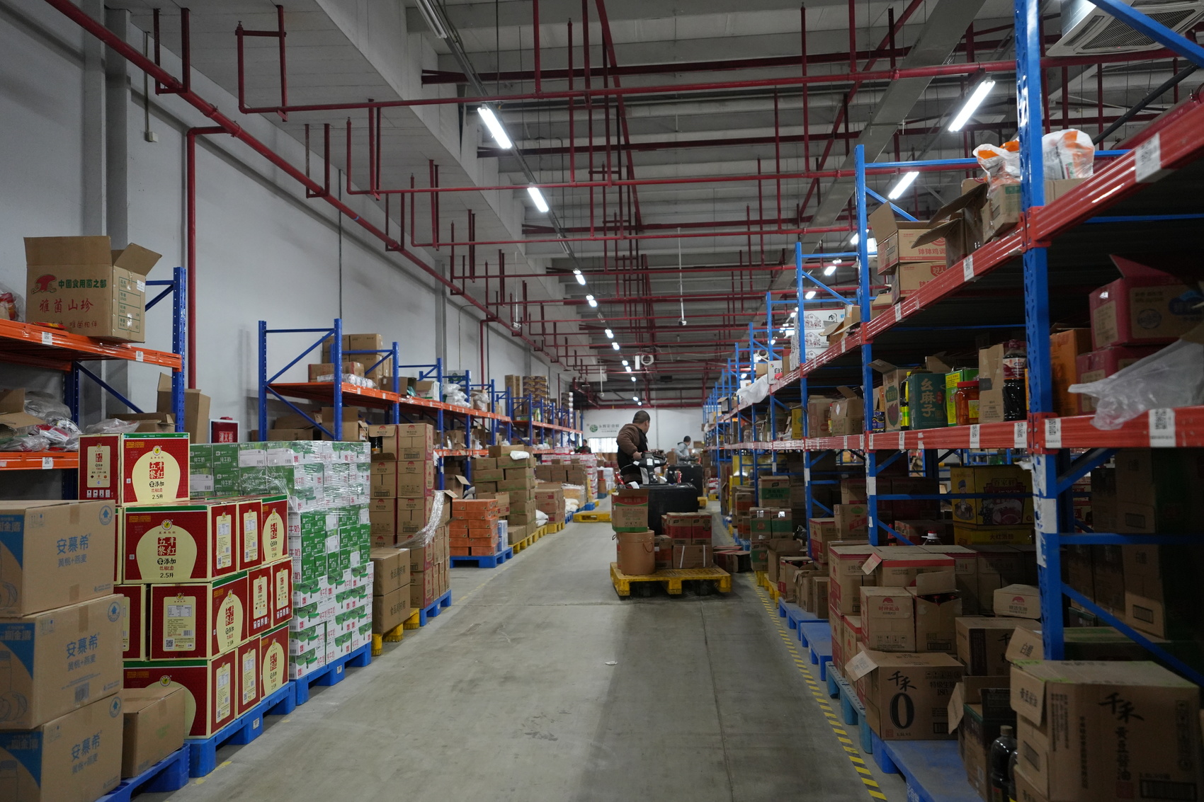 这种可视化管理延伸至每个环节。调味品车间里,粮油、酱醋等货品整齐码放在立体货架上。几名工作人员手持PDA,在不同货架间熟练穿梭——扫码、取货、转身放入转运车,动作流畅利落。乍一看,这场景与快递驿站的扫码取件颇有几分相似。