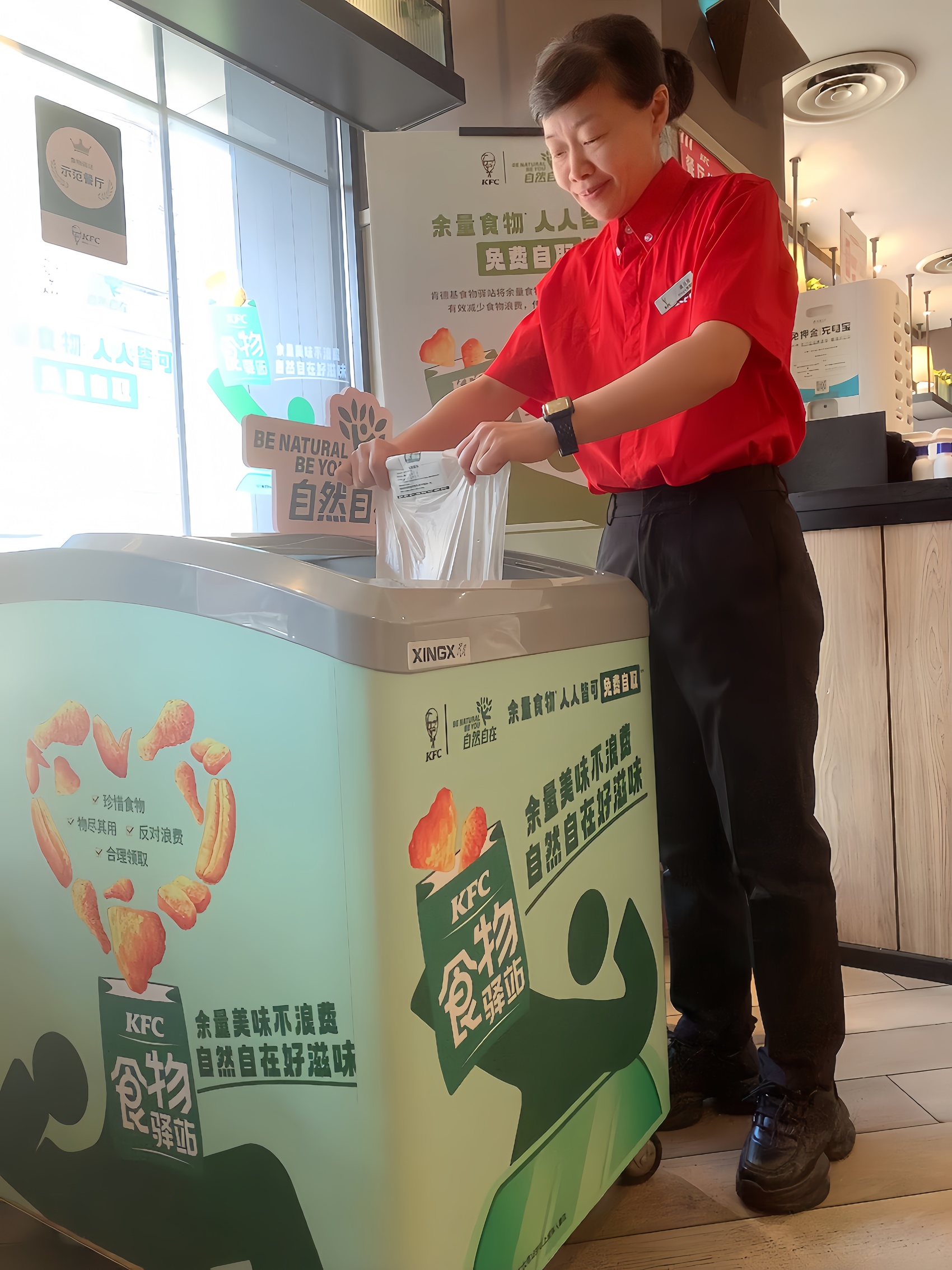 肯德基新阳餐厅楼面经理逄月芳将余量食物放进食物驿站冰箱