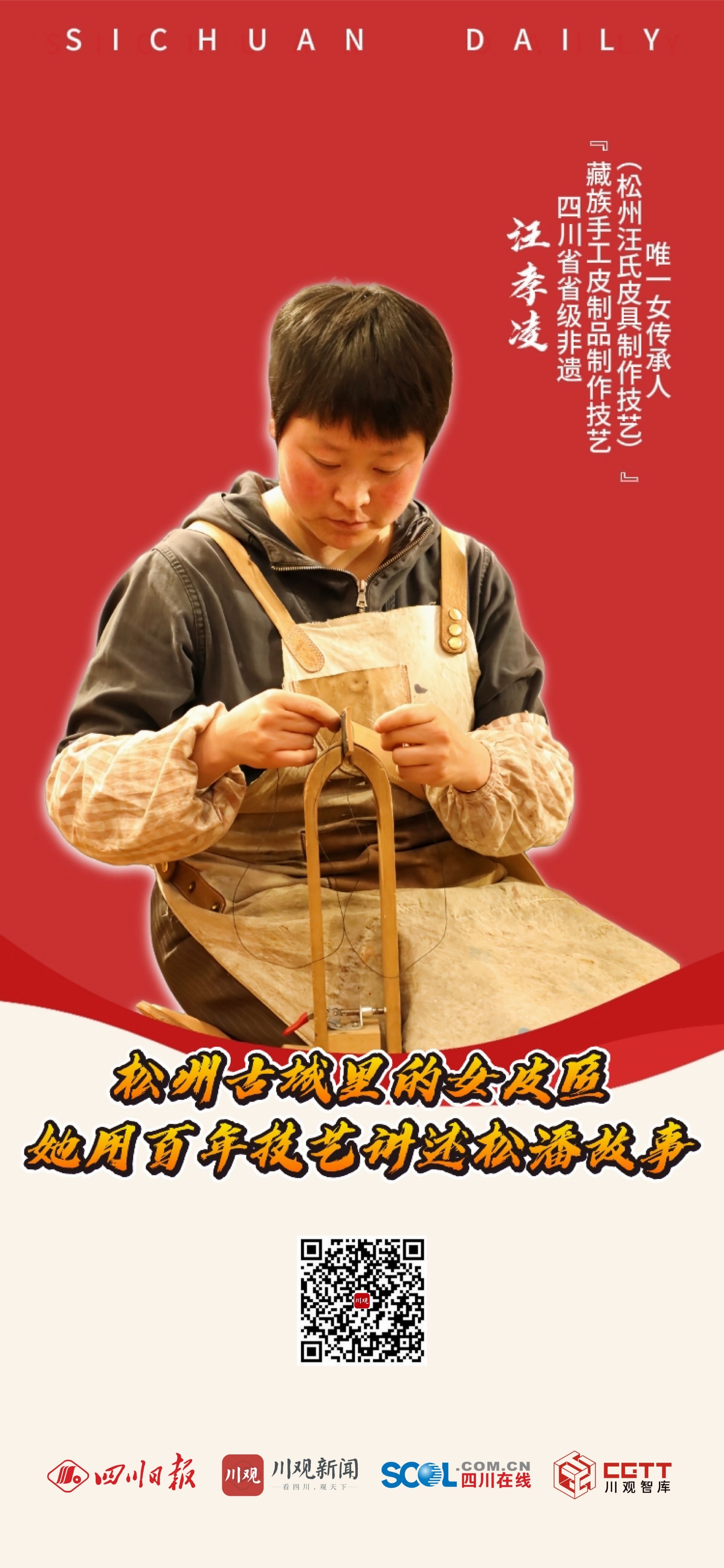 汪孝凌是松潘汪皮匠第五代传承人,也是唯一一位女传承人。她所传承的正是四川省省级非遗项目“藏族手工皮制品制作技艺(松州汪氏皮具制作技艺)。