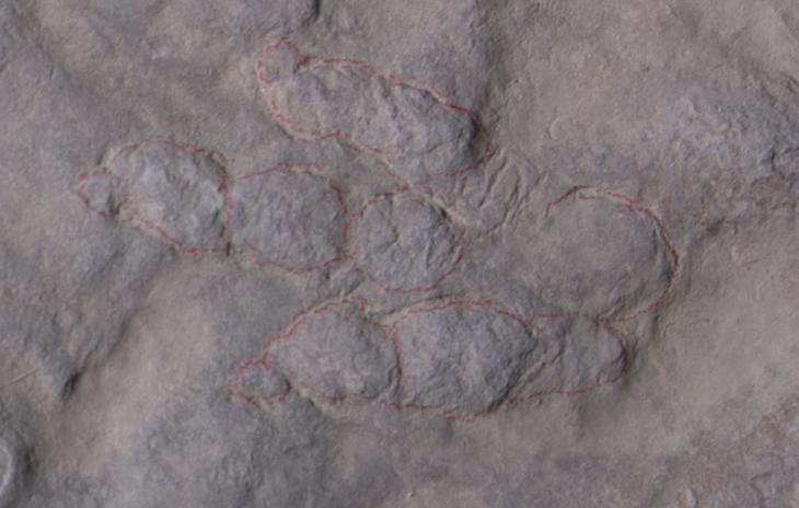 据介绍,实雷龙足迹同样由希区柯克命名,其典型特征是体型较大(足迹长度通常超过25厘米),是北美、欧洲等地早侏罗世地层中最常见的大型兽脚类足迹。它与跷脚龙足迹、安琪龙足迹(Anchisauripus)是最典型的兽脚类恐龙足迹组合。