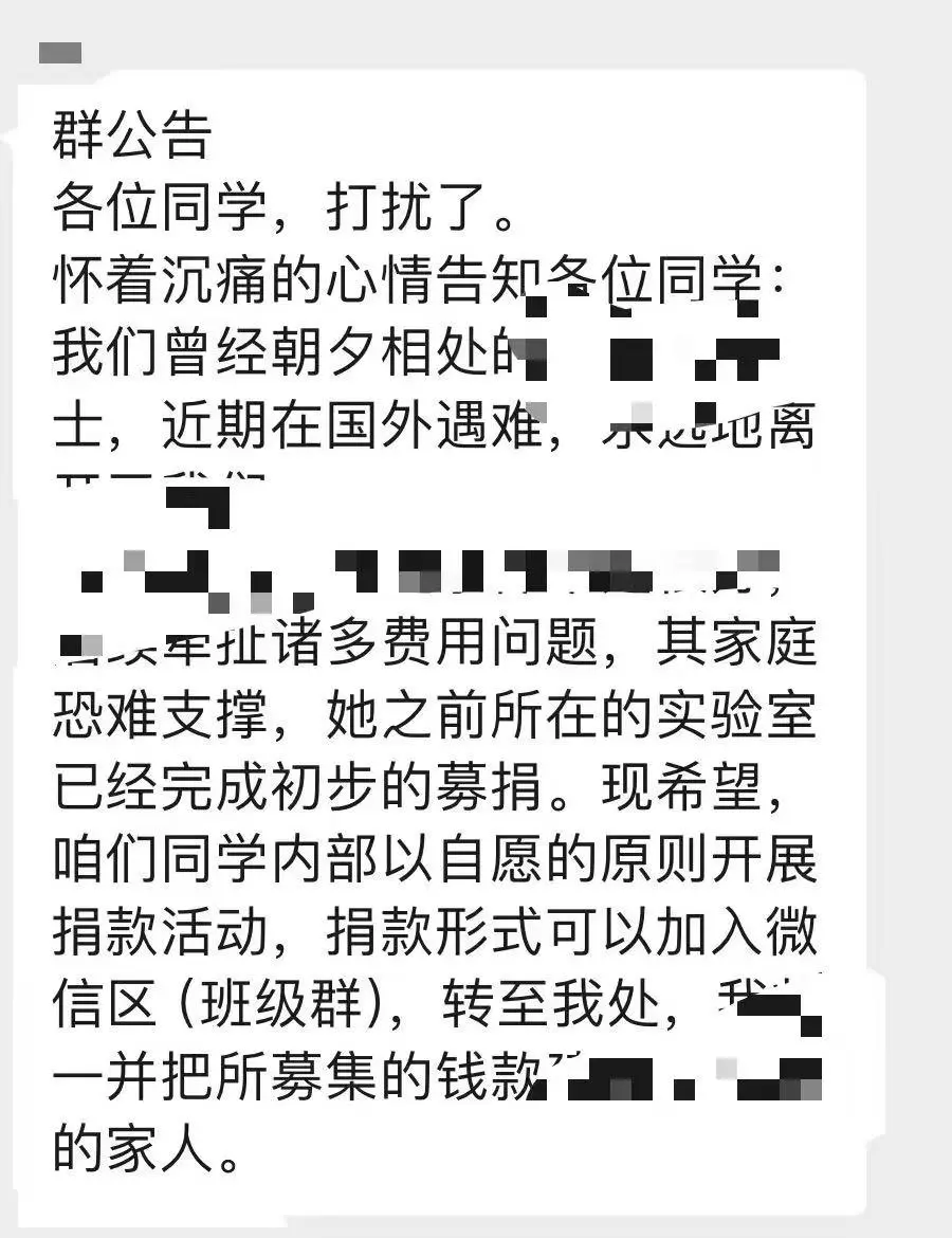 小刘告诉记者,她于12月5日得知当年的室友遇害的消息,当时大学班长组建了一个群聊,想要为丽丽父母筹集赴德的路费。随后,记者联系到发起筹款的班长赵先生(化姓)。赵先生表示,丽丽的大学同学和研究生所在实验室的同学已经筹集了一笔资金给了丽丽父母。“听到这个消息特别遗憾,她真的是一个很努力、很朴素的人。”