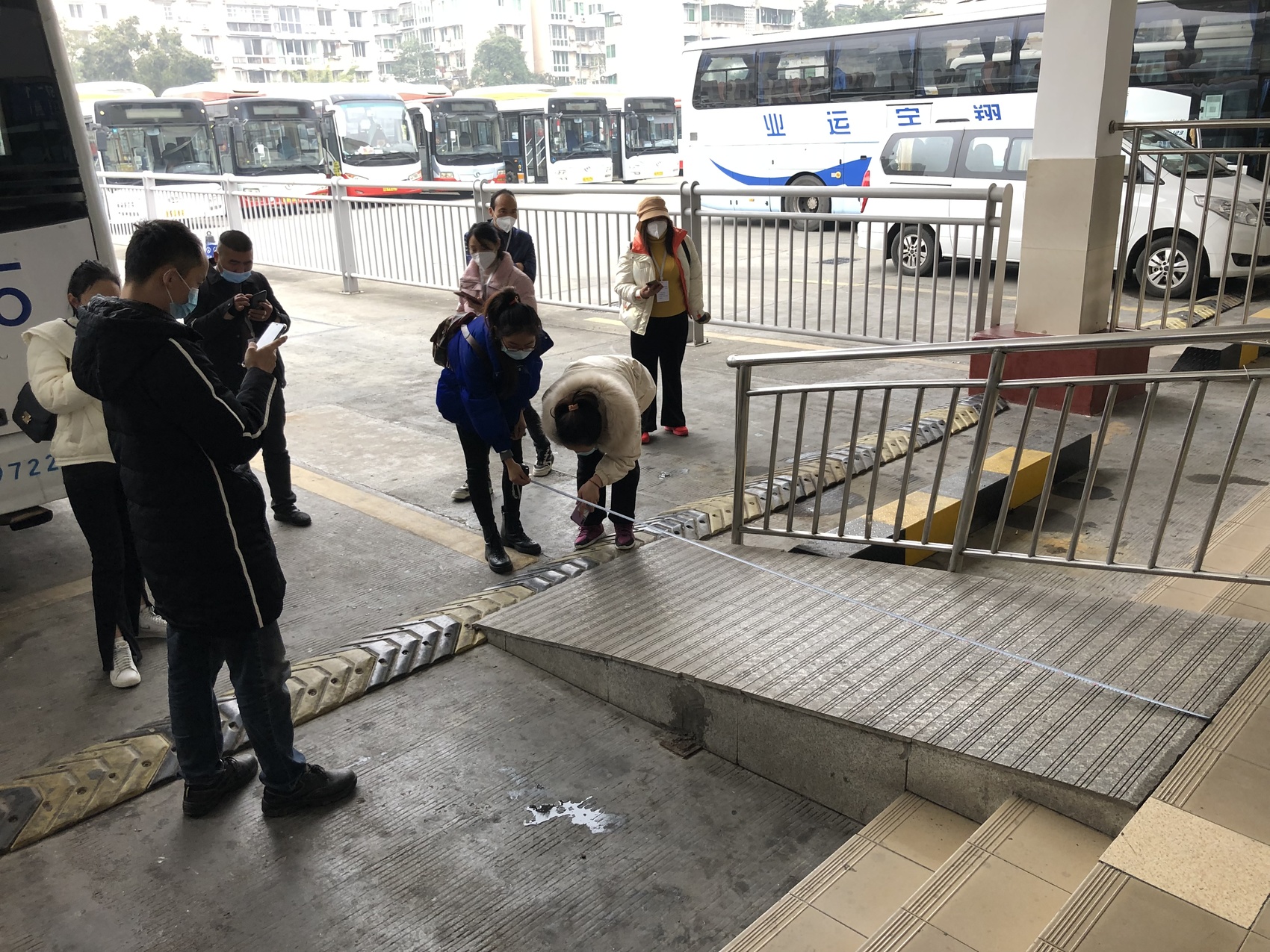 无障碍环境建设督导员正在对无障碍设施进行踏勘(四川省残疾人无障碍环境建设促进会供图)