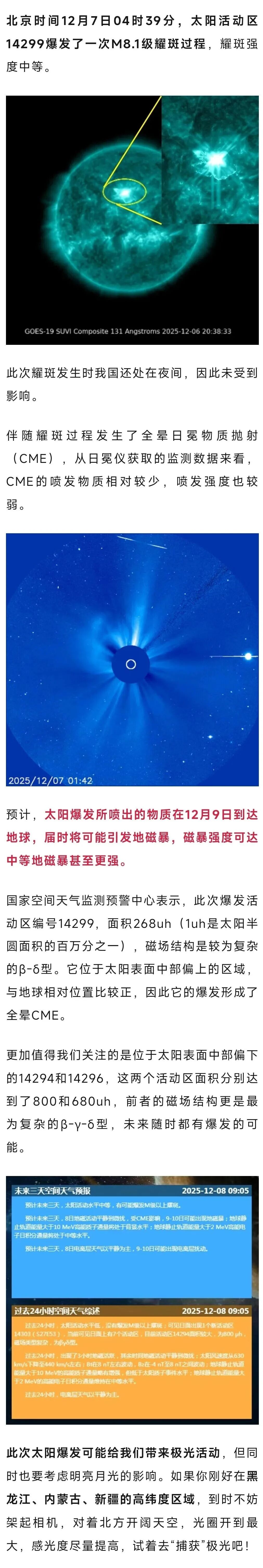 据央视消息,12月7日太阳爆发了一次耀斑过程,所喷出的物质在12月9日到达地球,届时将可能引发地磁暴,磁暴强度可达中等地磁暴甚至更强。