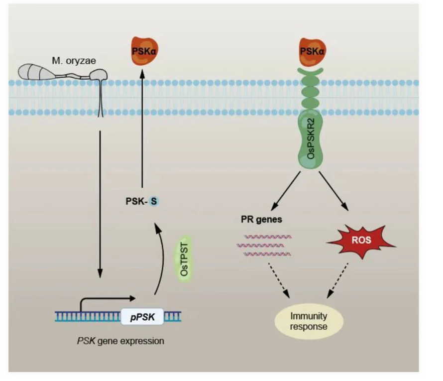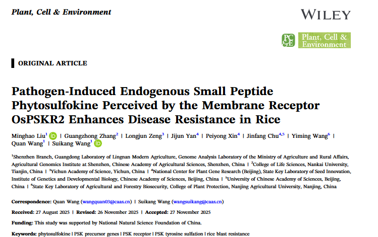 近期,由中国农业科学院深圳农业基因组研究所等多家机构合作的研究在《Plant Cell & Environment》杂志发表,首次系统阐明了植物内源小肽PSK如何通过受体OsPSKR2增强水稻对稻瘟病和白叶枯病的抗性,而且不牺牲产量。这一发现为水稻抗病育种开辟了新方向。