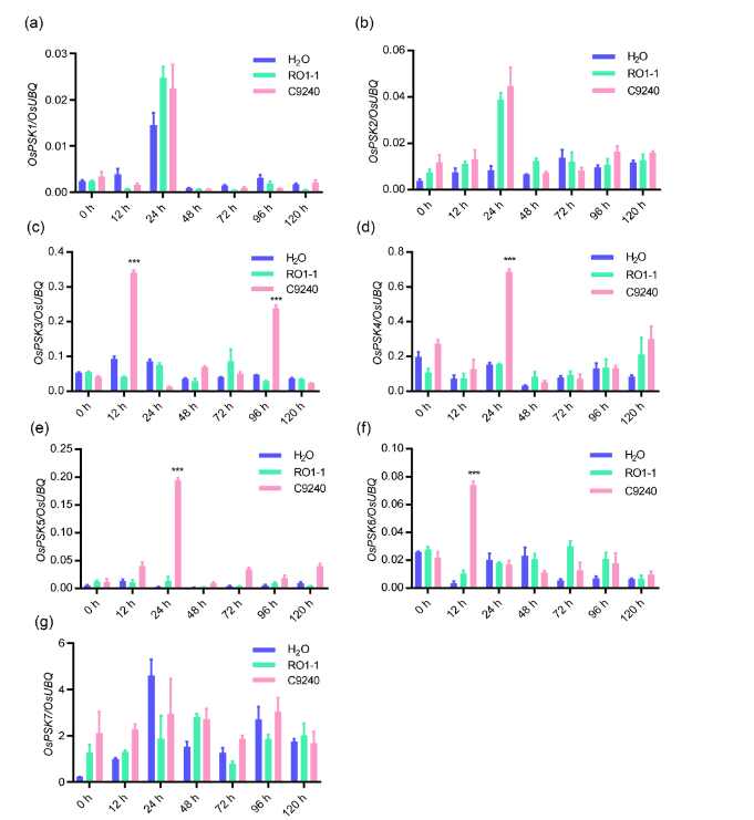 研究团队首先检测了水稻中7个PSK前体基因(OsPSK1-OsPSK7)在稻瘟菌侵染后的表达变化。结果显示,OsPSK3、4、5、6在病原侵染后显著上调,特别是OsPSK4和OsPSK5在侵染24小时后表达量大幅增加。这暗示了PSK可能参与水稻的免疫应答。
