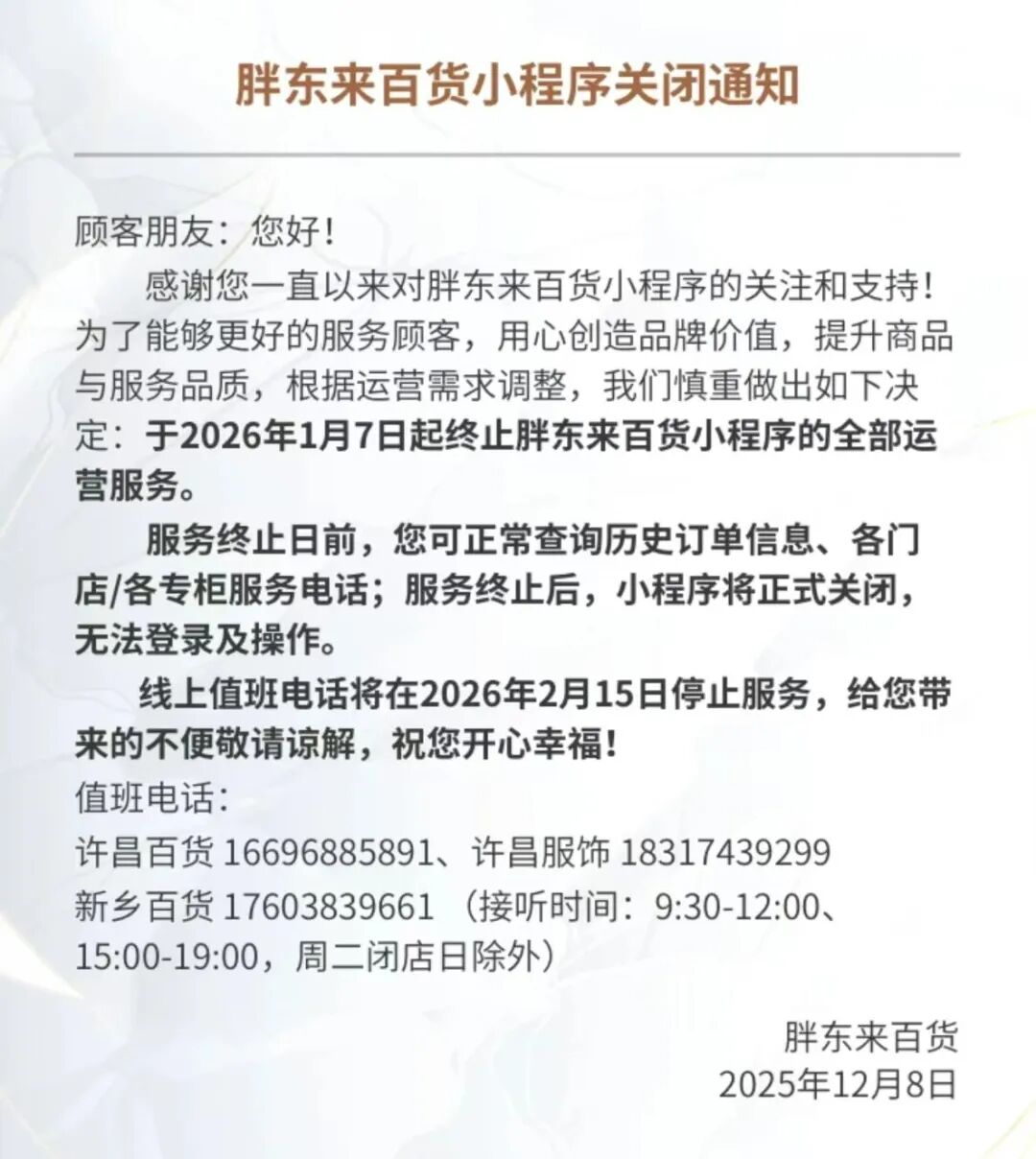 近日,胖东来百货小程序发布关闭通知:感谢您一直以来对胖东来百货小程序的关注和支持!为了能够更好地服务顾客,用心创造品牌价值,提升商品与服务品质,根据运营需求调整,我们慎重做出如下决定:于2026年1月7日起终止胖东来百货小程序的全部运营服务。