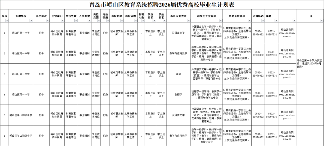 日前,《青岛市崂山区教育系统公开招聘2026届优秀高校毕业生简章》对外发布,青岛市崂山区教育系统计划招聘2026届优秀高校毕业生10人。目前,报名已启动,部分信息如下: