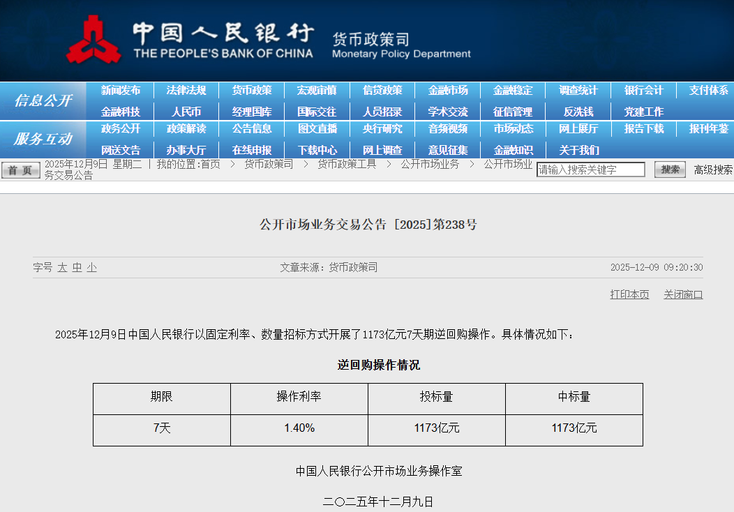 中国人民银行(以下简称“央行”)12月9日公告表示,以固定利率、数量招标方式开展了1173亿元7天期逆回购操作。