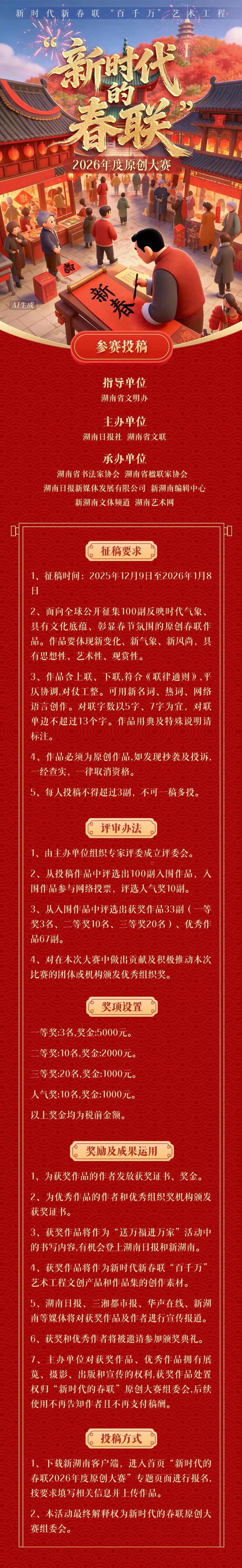 参赛者可通过下载新湖南客户端,进入首页“新时代的春联2026年度原创大赛”专题页面报名,按要求填写信息并上传作品。