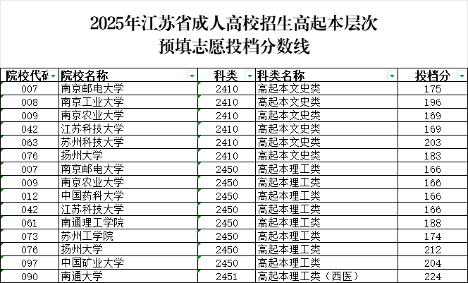 2025年江苏省成人高校招生高起本层次预填志愿投档分数线