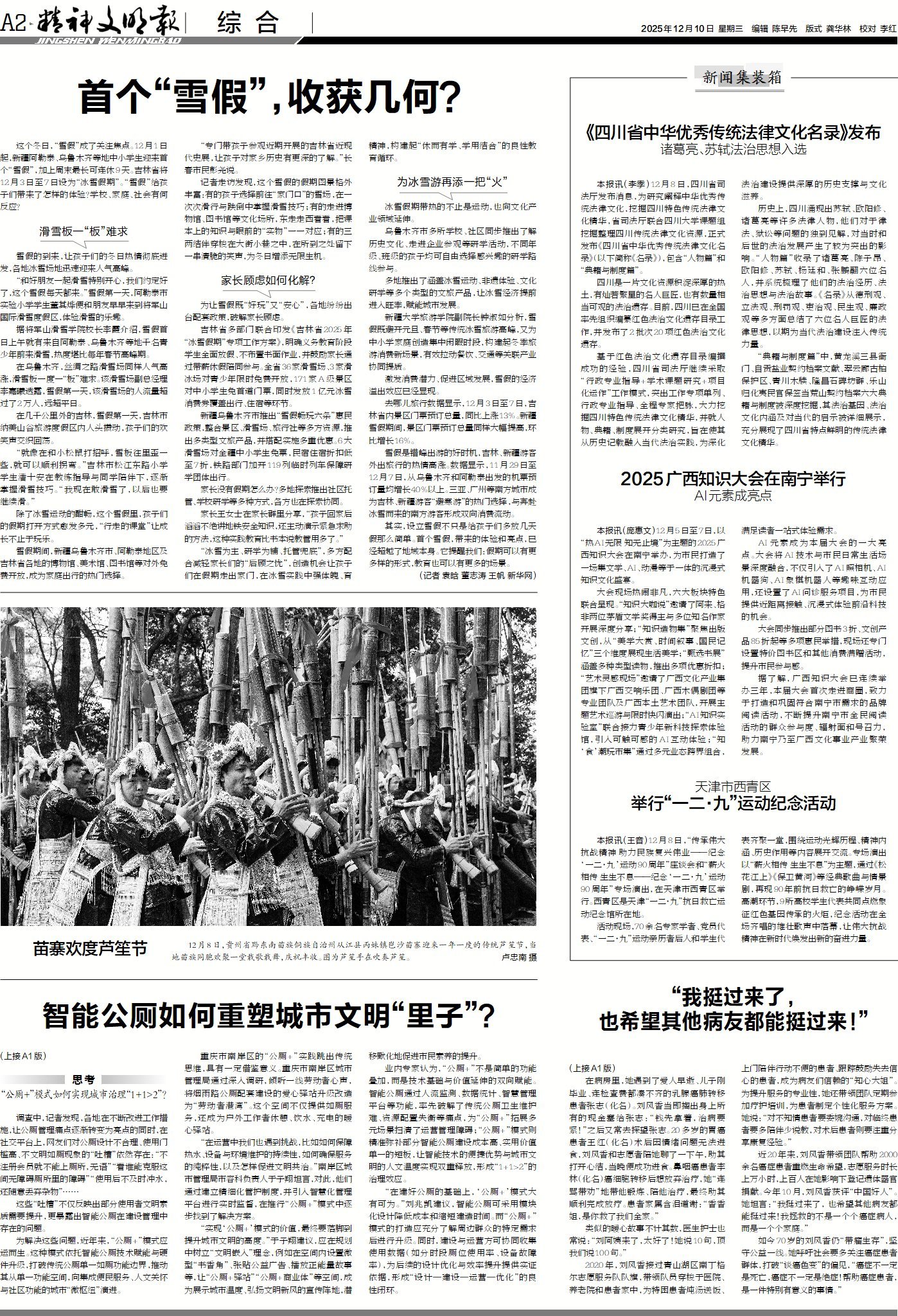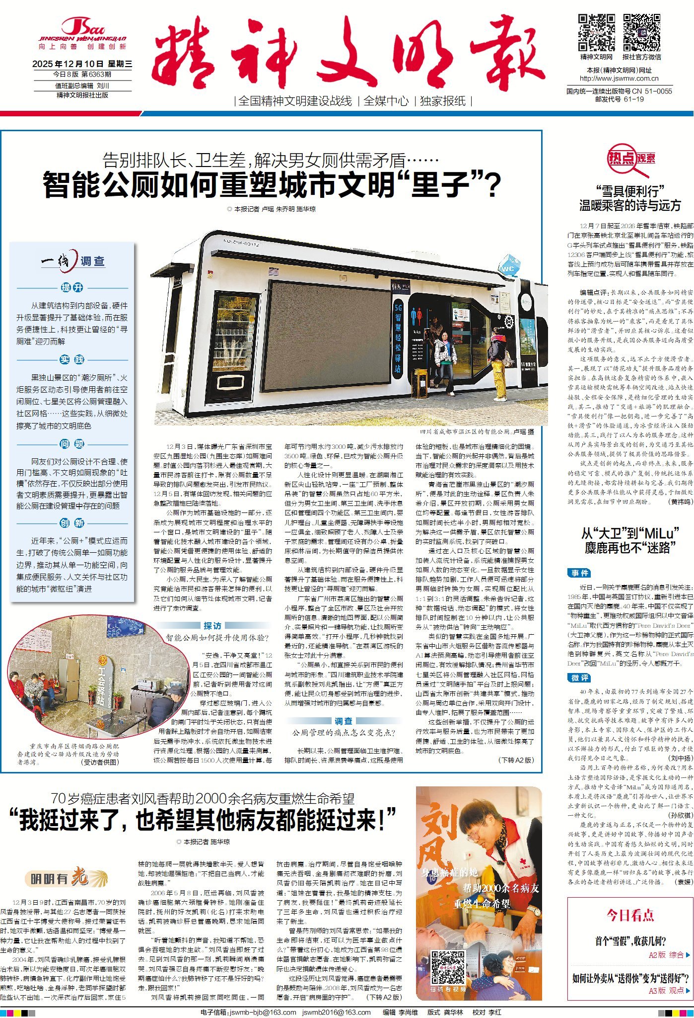 今日版面“早”知道:A1版头条聚焦智能公厕如何重塑城市文明“里子”?给市民和游客带来实实在在的便利;《热点观察》栏目关注铁路部门试点推出“雪具便利行”服务,温暖乘客旅途。从“大卫”到“MiLu”,看麋鹿这一珍稀物种的国际名称变化代表了什么。A2版“综合”版关注“雪假”给孩子们带来了怎样的体验?学校、家庭、社会有什么样的反应?A3版《文明棱镜》栏目探讨如何让外卖从“送得快”变为“送得好”?超时配送免罚值得点赞!