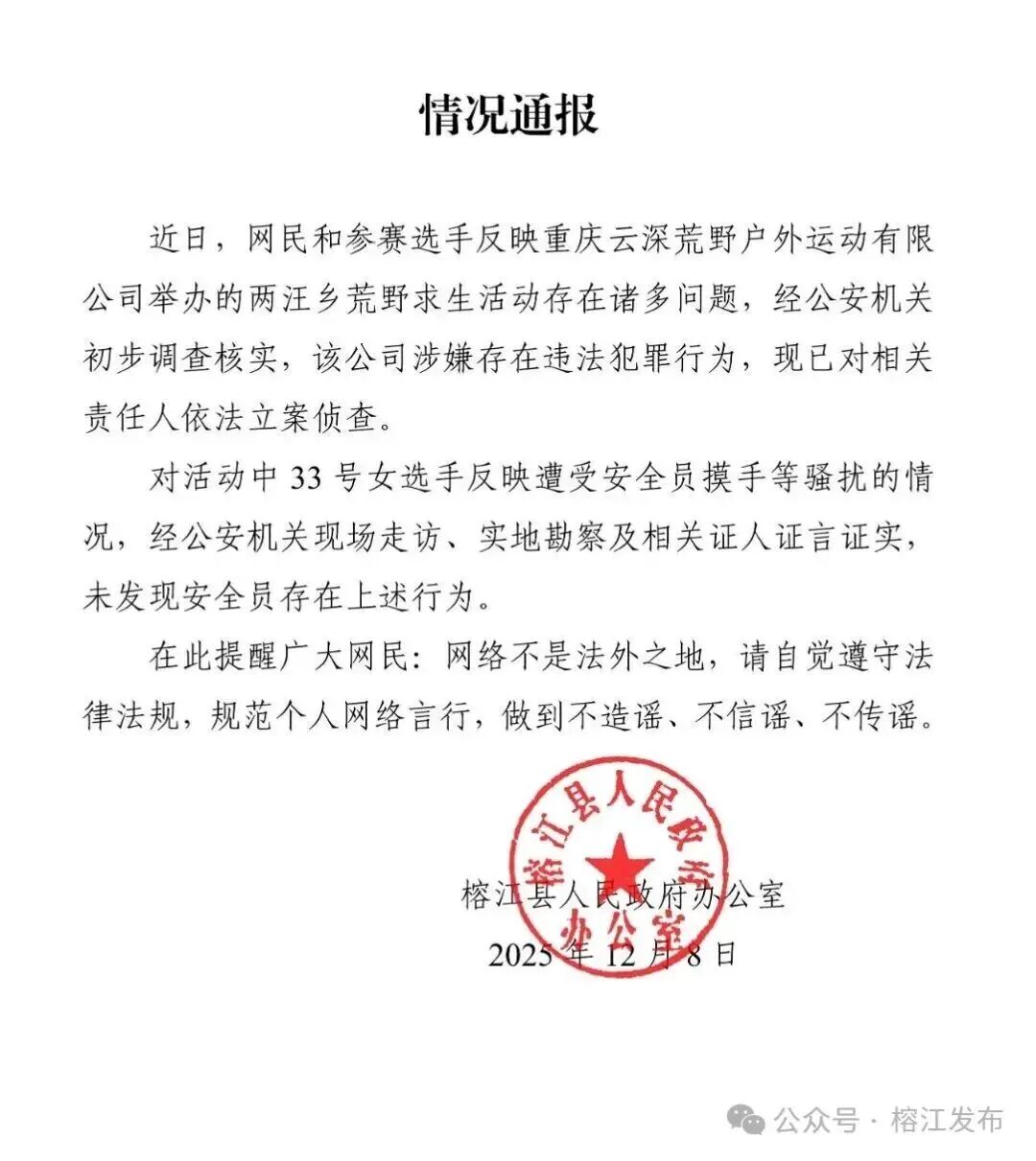 贵州榕江深夜通报:“荒野求生赛”相关责任人被警方立案侦查 贵州黔东南州榕江县政府办公室12月8日发布情况通报:近日,网民和参赛选手反映重庆云深荒野户外运动有限公司举办的两汪乡荒野求生活动存在诸多问题,经公安机关初步调查核实,该公司涉嫌存在违法犯罪行为,现已对相关责任人依法立案侦查。对活动中33号女选手反映遭受安全员摸手等骚扰的情况,经公安机关现场走访、实地勘察及相关证人证言证实,未发现安全员存在上述行为。(榕江发布)