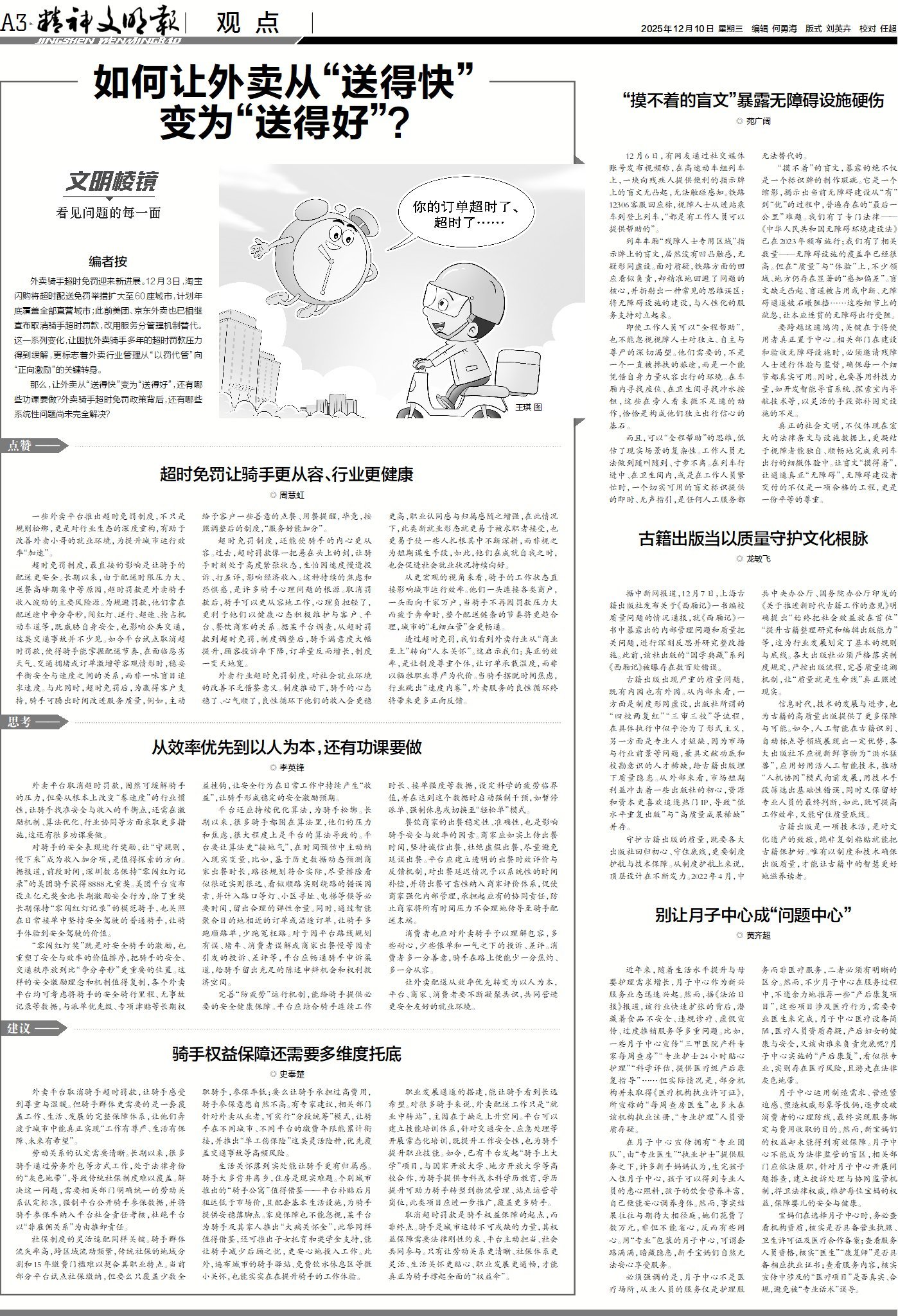 让外卖配送从效率优先转变为以人为本,平台、商家、消费者要不断凝聚共识,共同营造更安全友好的就业环境。