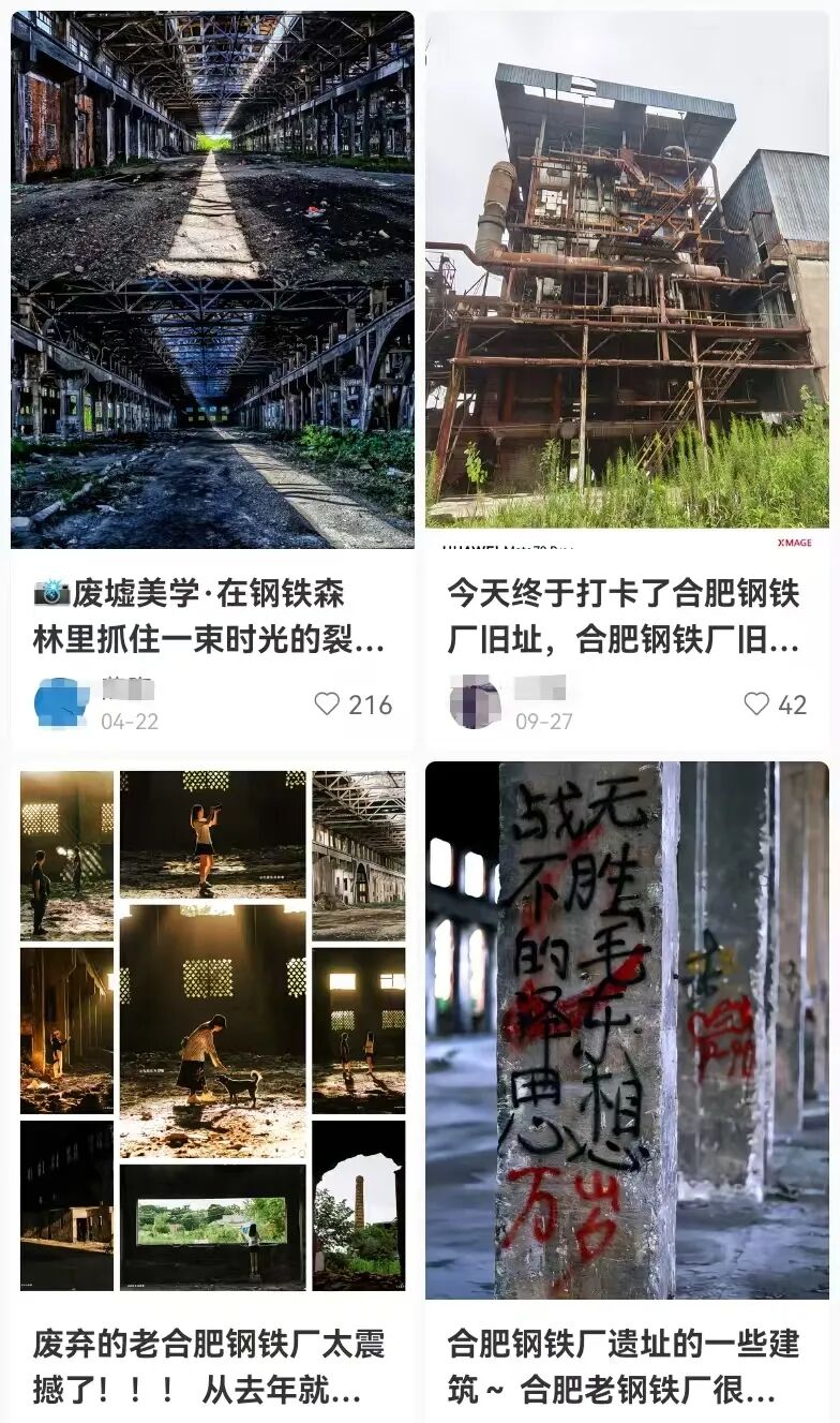 以“合肥钢铁厂”为关键词在互联网平台上进行搜索,“废墟美学”“蒸汽朋克”成为吸睛标签,吸引一批年轻人前来“打卡出片”。网友合肥摄影师一哲表示:“感觉十分震撼,拍照太出片了!”
