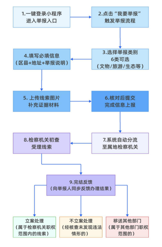 “‘乐在嘉州’随手拍举报小程序主要分为三个板块,分别是举报、线索查询、操作流程简介。举报板块主要包括生态环境与资源保护、文物文化遗产保护、食品药品安全、旅游安全、无障碍环境建设等类别。”乐山市人民检察院第六检察部副主任蒋云介绍,举报板块作为核心功能区,严格围绕公益诉讼中的重点领域进行分类设计,精准对接乐山文旅发展与民生保障需求,无论是破坏景区文物古迹、污染生态环境,还是旅游消费中的侵权行为,市民游客均可随时通过小程序进行举报提交。检察机关将安排专人负责接收和核查相关举报线索,并及时向举报人反馈处理进展和结果。