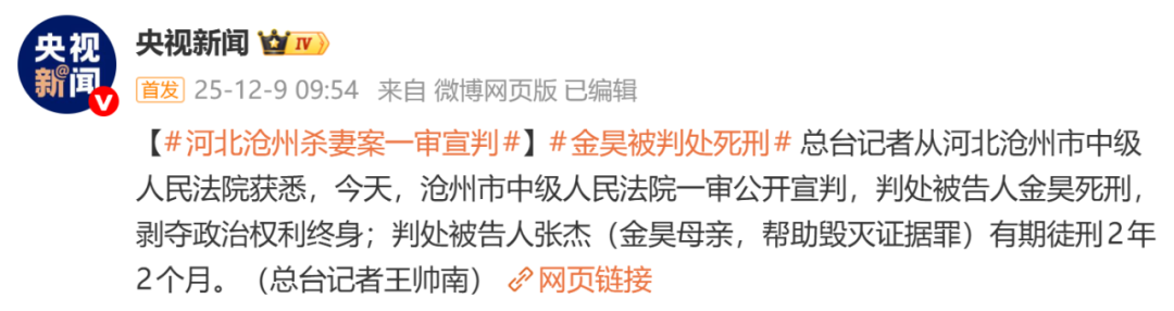 据央视新闻报道,记者从沧州市中级人民法院获悉,2025年12月9日,沧州市中级人民法院一审公开宣判,判处被告人金昊死刑,剥夺政治权利终身;判处被告人张杰(金昊母亲,帮助毁灭证据罪)有期徒刑2年2个月。
