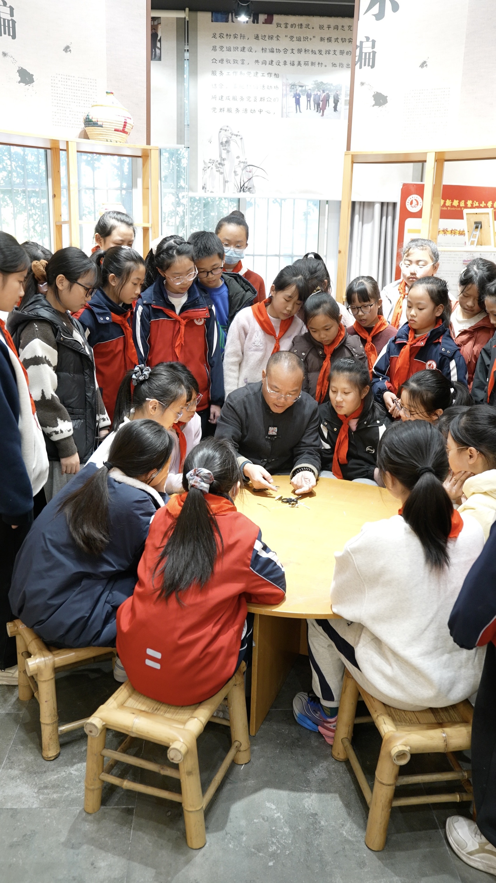 如今的新繁棕编,已从村落走向更广阔的天地,成为新都文旅的闪亮名片。罗志勇并未局限于工作室,每周一到周五他都会穿梭于新繁的中小学和大学课堂,推动“非遗进校园”;全国各地的爱好者也慕名来到他的村落工作室,跟着他学习艺术棕编技法。