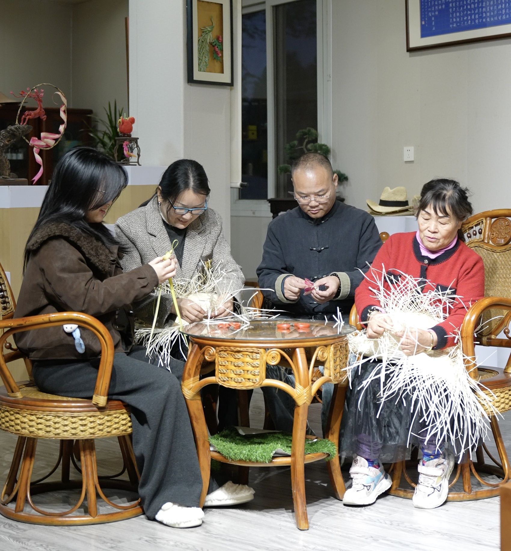 罗志勇(右二)一家三代正在编棕编。