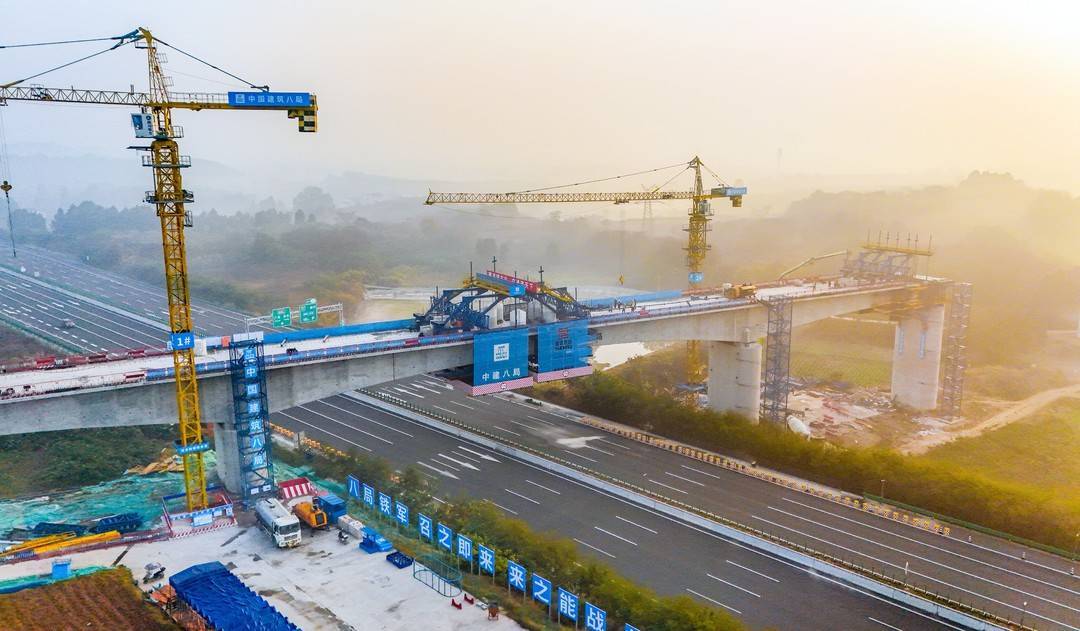 12月10日,记者从蜀道铁路投资集团获悉,绵遂资内铁路牌坊湾特大桥跨汉蓉高速公路连续梁顺利合龙,这是项目全线第一个合龙的跨高速公路连续梁。