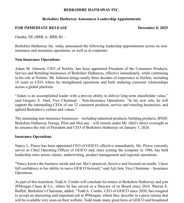 伯克希尔公司层面的变动还包括首席财务官的退休。高级副总裁兼首席财务官马克·汉堡(Marc D. Hamburg)将在为伯克希尔服务40年后,于2027年6月1日退休。“马克对伯克希尔和我而言都是不可或缺的。他的正直与判断力无可估量。他为公司所做的贡献远超许多股东的认知。”巴菲特表示。查尔斯·常(Charles C. Chang)将于2026年6月1日起接任高级副总裁兼首席财务官的职务。查尔斯将常驻奥马哈,他是现任伯克希尔哈撒韦能源公司高级副总裁兼首席财务官(自2024年任职)。在加入伯克希尔哈撒韦能源之前,查尔斯曾是普华永道合伙人,在上市公司财务报告及并购领域拥有超过三十年经验,曾为普华永道多家顶级客户提供服务。迈克尔·奥沙利文(Michael J. O’Sullivan)将于2026年1月1日起担任伯克希尔高级副总裁兼总法律顾问,他同样将在奥马哈办公。加入伯克希尔前,迈克尔·奥沙利文曾担任科技公司Snap Inc.的总法律顾问。此前,他还在芒格、托尔斯与奥尔森律师事务所执业超过二十年,为公司提供公司治理、诉讼及并购方面的法律咨询服务。此项任命标志着伯克希尔哈撒韦新设了一个公司职位——数十年来,伯克希尔主要依靠外部法律顾问处理公司事务。此外非保险业务方面,航空公司NetJets首席执行官亚当·约翰逊(Adam M. Johnson)即日起被任命为伯克希尔消费产品、服务及零售业务总裁,同时继续担任NetJets首席执行官。亚当·约翰逊在NetJets拥有近三十年从业经验,其中十年担任首席执行官。其余非保险业务——包括工业产品、建筑材料、BNSF铁路、伯克希尔哈撒韦能源、Pilot旅行中心和McLane供应链服务——在格雷格·阿贝尔于2026年1月1日接任伯克希尔首席执行官后,将继续由其直接领导。