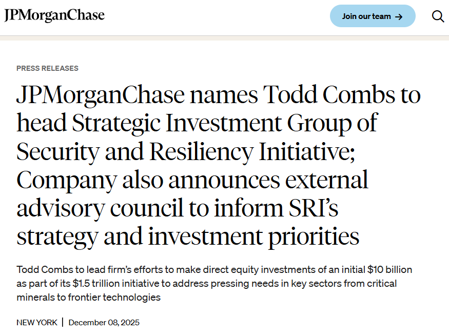 摩根大通官网公告显示,托德·康布斯将领导该公司新近启动的“安全与韧性倡议”(SRI)旗下规模达100亿美元的战略投资集团。该计划旨在助力企业提升增长动能、激发创新活力并加速制造业发展。