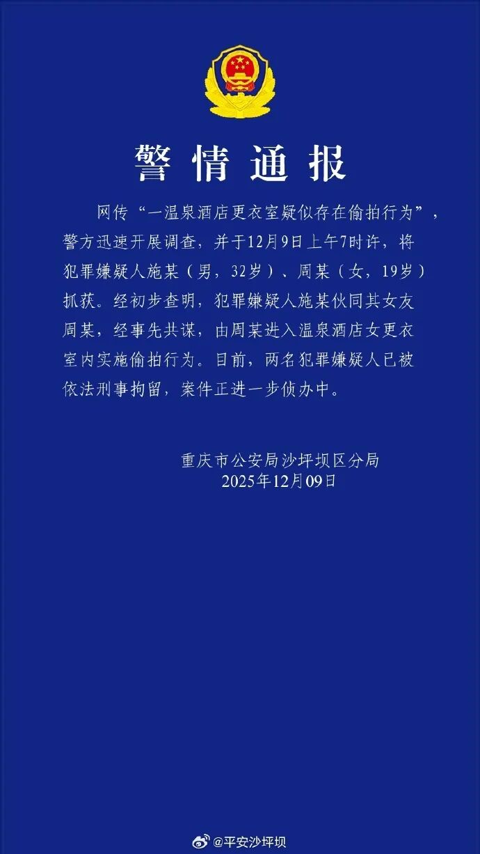 经初步查明,犯罪嫌疑人施某伙同其女友周某,经事先共谋,由周某进入温泉酒店女更衣室内实施偷拍行为。目前,两名犯罪嫌疑人已被依法刑事拘留,案件正进一步侦办中。
