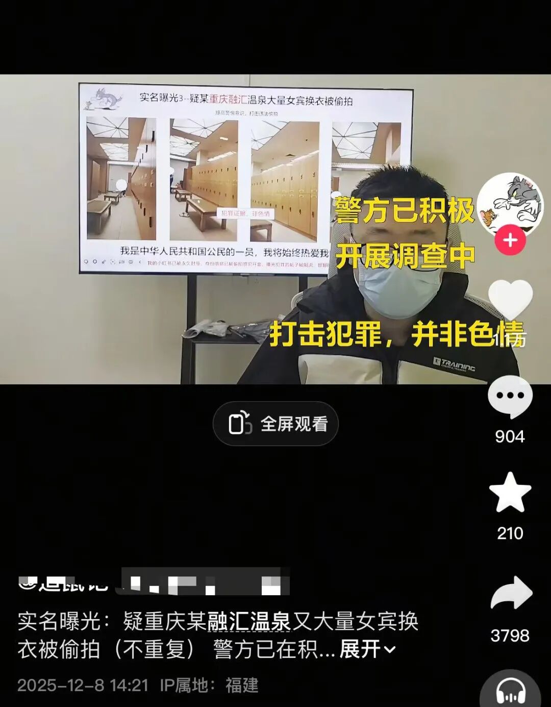 近日,“网友视频曝光重庆一温泉大量女宾洗浴疑被偷拍”引发热议。视频中内包含多个非正常视角拍摄的室内画面,画面中有多排储物柜和印有“融汇温泉”字样的物品。该网友称,该温泉疑似有大量女宾入浴被偷拍。