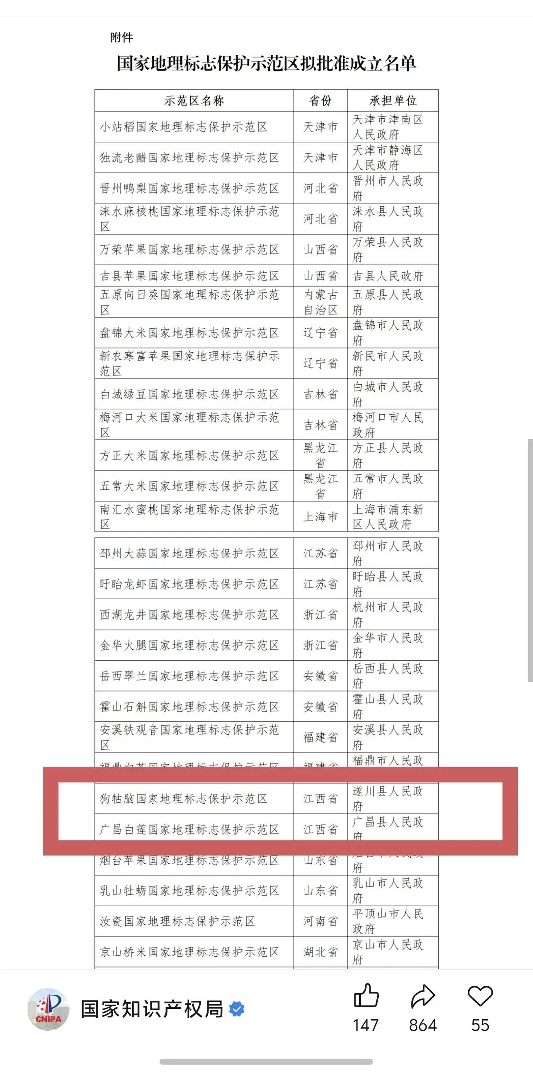 近日,国家知识产权局公布新一批国家地理标志保护示范区名单,江西“狗牯脑茶”“广昌白莲”凭借过硬品质和强劲产业影响力成功上榜。