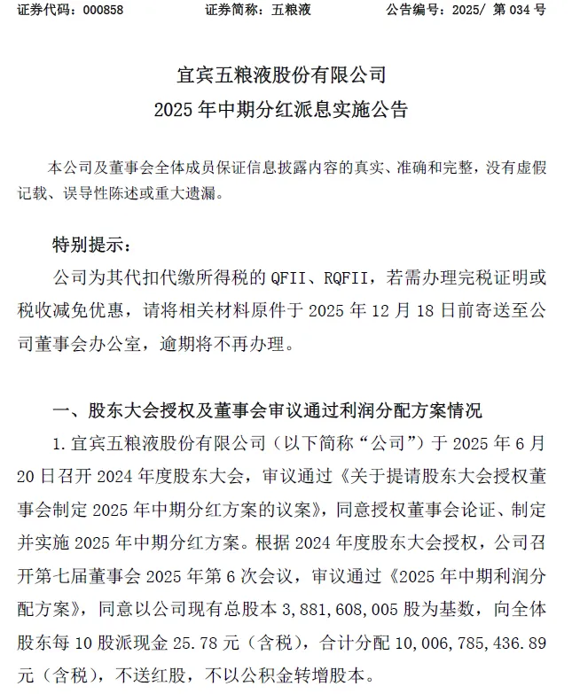 12月10日,《宜宾五粮液股份有限公司2025年中期分红派息实施公告》发布。公告显示,五粮液拟以总股本3,881,608,005股为基数,向全体股东每10股派现金25.78元(含税),合计派现约100亿元,股权登记日为2025年12月17日,除权除息日为2025年12月18日。