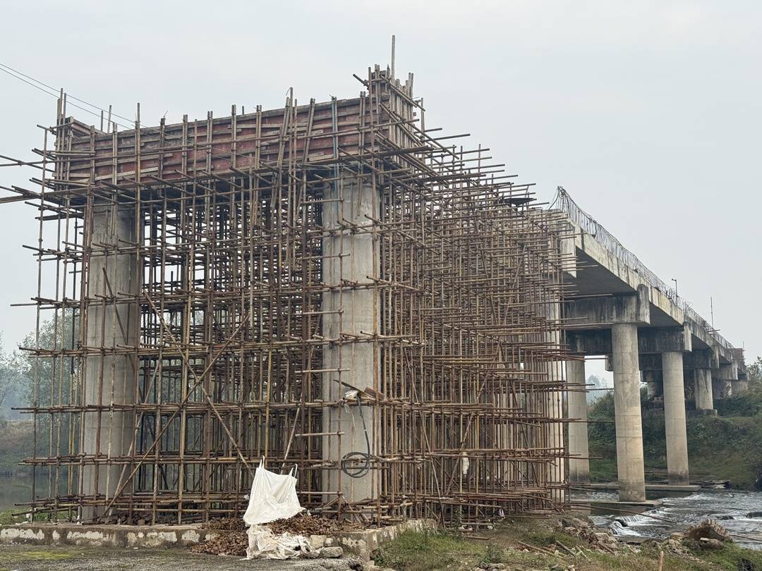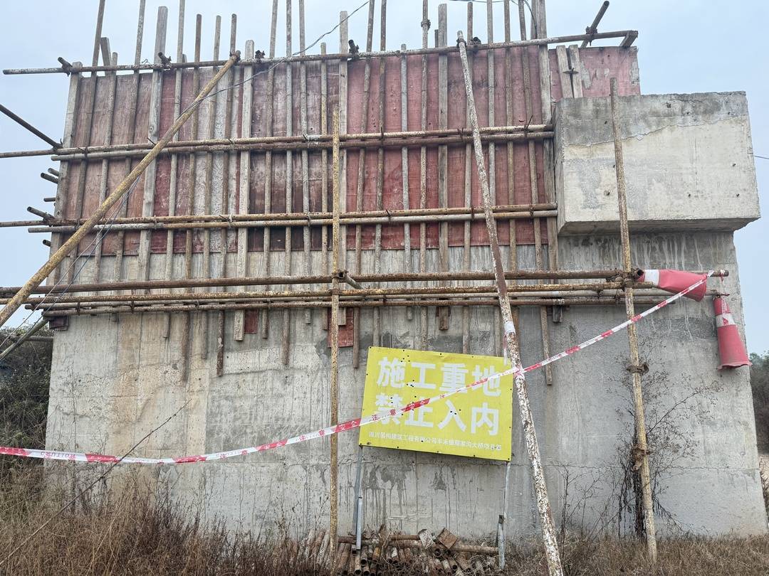 在施工现场,河道中央矗立着十余个已建成的桥墩,部分桥面已完成铺设,但关键的连接段仍留有明显缺口。两岸引道已有部分完成硬化,未完工的桥体结构表面覆盖着防护材料。整个工地空无一人,仅有一块“施工重地,禁止入内”的安全警示牌立在路边。