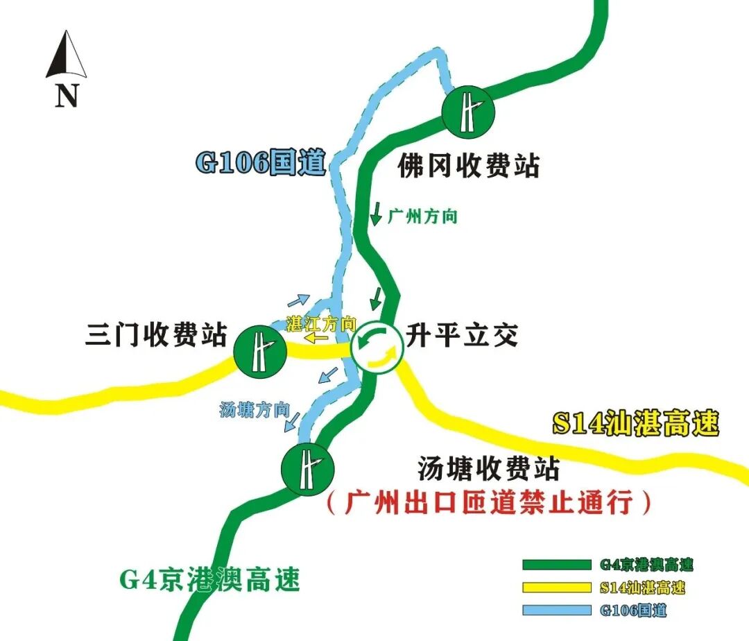 方案一:经由G4京港澳高速公路往广州方向→升平立交→S14汕湛高速往湛江方向→三门站→G106国道往汤塘方向。