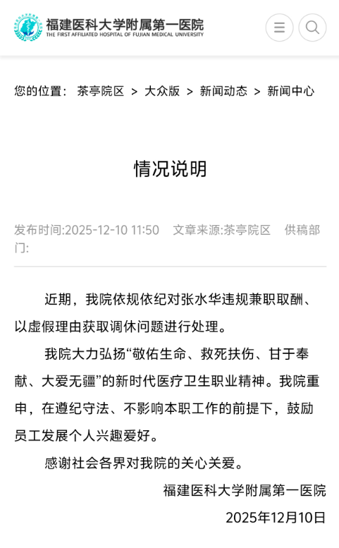 12月10日11时50分,福建医科大学附属第一医院发布情况说明,证实医院依规依纪对张水华违规兼职取酬、以虚假理由获取调休等问题进行处理。