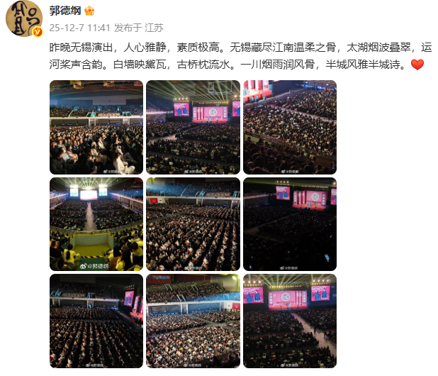 据了解,11月26日,德云社北展相声专场中,郭德纲、于谦表演了相声《艺高人胆小》,有观众向北京市西城区文旅局投诉该段相声中存在伦理哏、荤段子等低俗内容。12月7日,郭德纲发布微博“昨晚(6日)无锡演出,人心雅静,素质极高。”