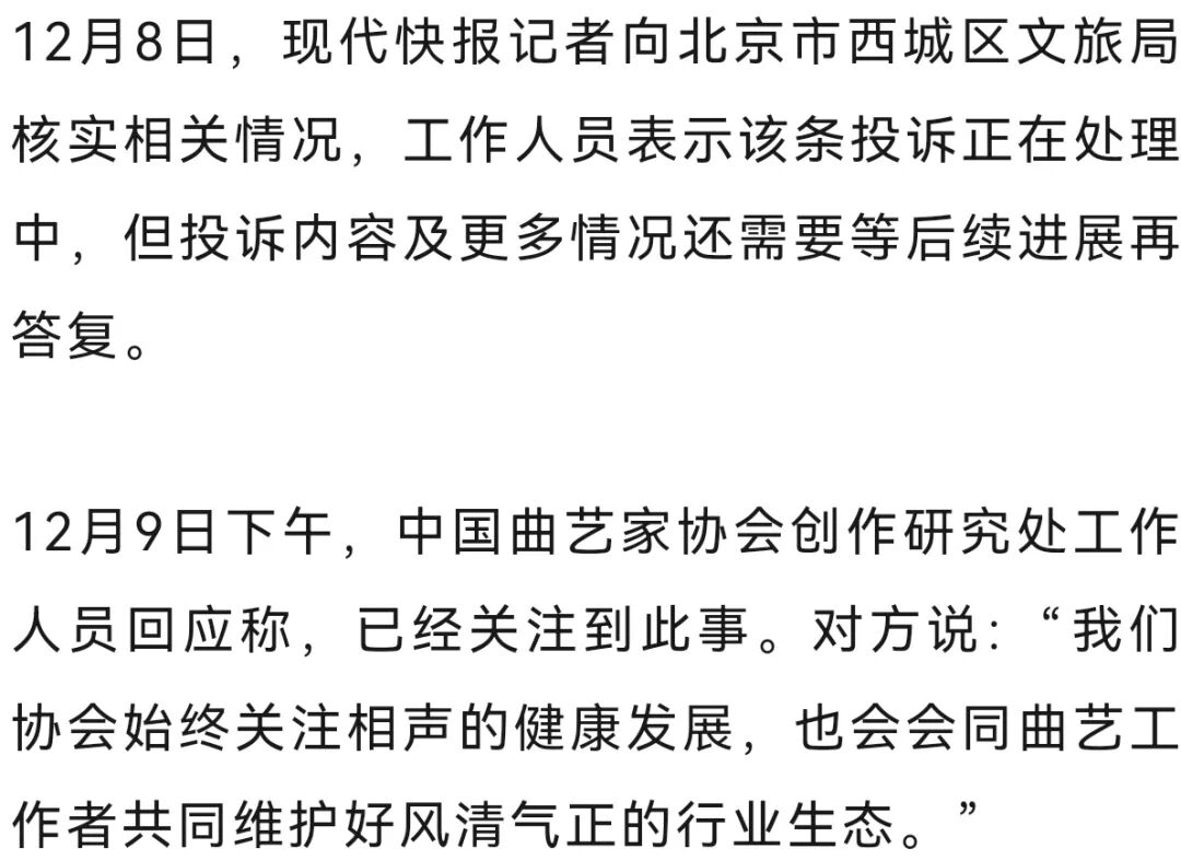 12月9日,中国曲艺家协会创作研究处回应现代快报记者称,已经关注到此事,将会同曲艺工作者共同维护好风清气正的行业生态。