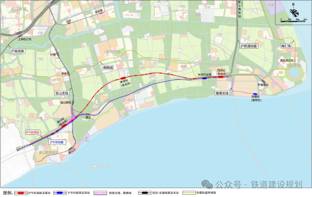 另同步建设浦东铁路扩能工程、新建金山铁路联络线、新建南港支线、新建独山港支线、芦潮港支线电化。其中浦东铁路扩能工程包括金山园区(不含)至漕泾(含)既有线改建及电化长度5.2km,增二线及电化长度6.5km;漕泾(含)至四团(含)电化并增二线长度36.1km。另外,原金山至平湖市域铁路海盐开发区~海盐东区段及海盐东车辆基地也在航评范围内,预计将同步建设,服务海盐县东南方向和市域列车运维工作。沪乍杭铁路的建设可缓解上海港公路运输压力,通过乍浦港实现江海联运,同时将打造环杭州湾货运铁路网;推动平湖独山港、嘉兴港区等临港工业区发展,同时可替代原沪平盐城际铁路功能,加速嘉兴融入上海大都市圈。