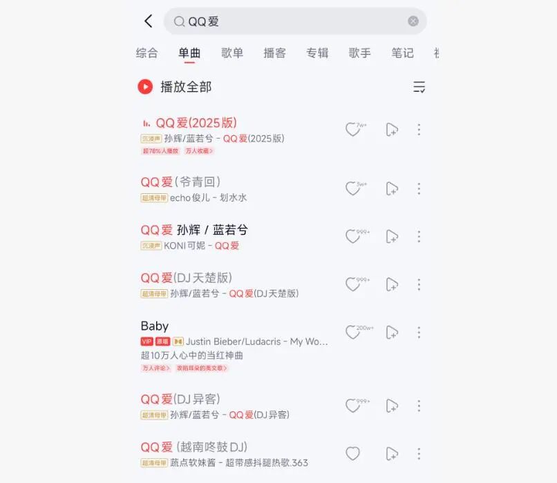 网易云音乐上搜索《QQ爱》后结果