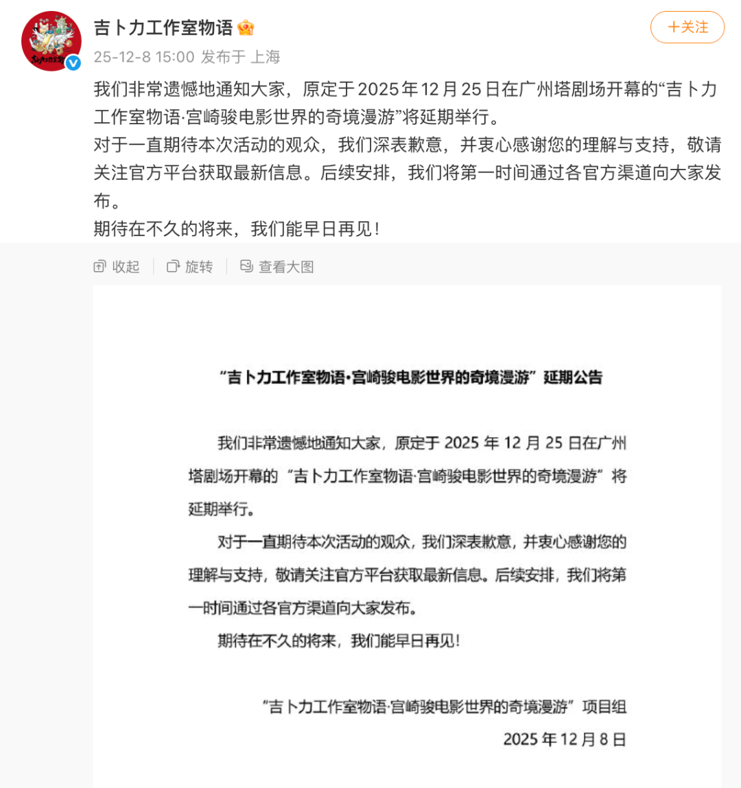 昨天(12月8日)下午,吉卜力工作室物语展览的官方微博 @吉卜力工作室物语 发布延期公告称,原定于2025年12月25日在广州塔剧场开幕的“吉卜力工作室物语·宫崎骏电影世界的奇境漫游”将延期举行。后续安排,将再通过各官方渠道发布。