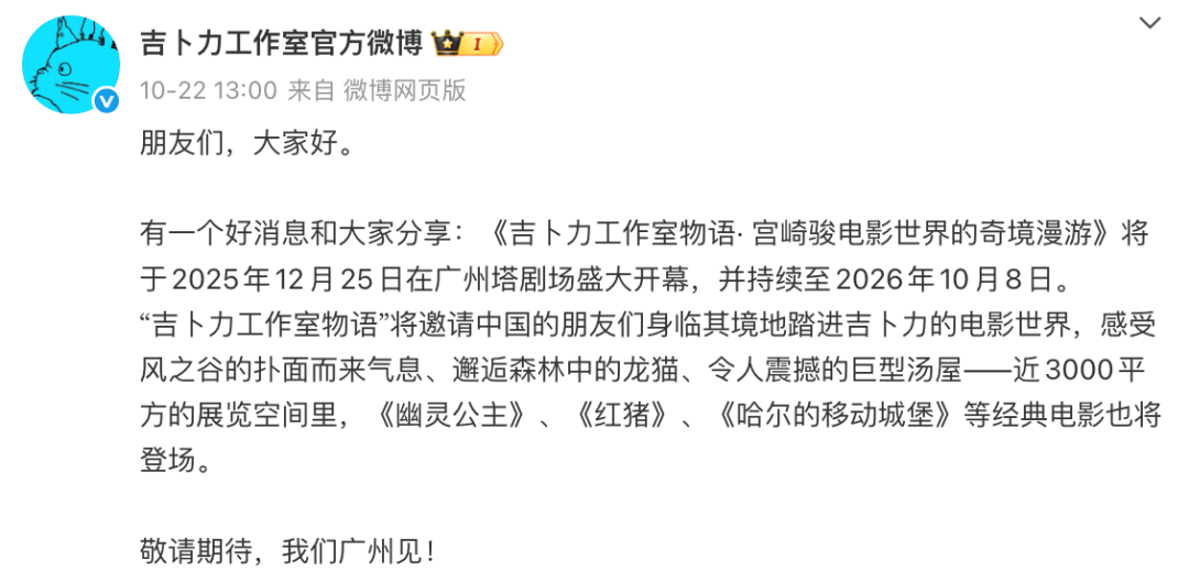 10月22日,@吉卜力工作室官方微博 发消息称,《吉卜力工作室物语· 宫崎骏电影世界的奇境漫游》将于2025年12月25日在广州塔剧场盛大开幕,并持续至2026年10月8日。