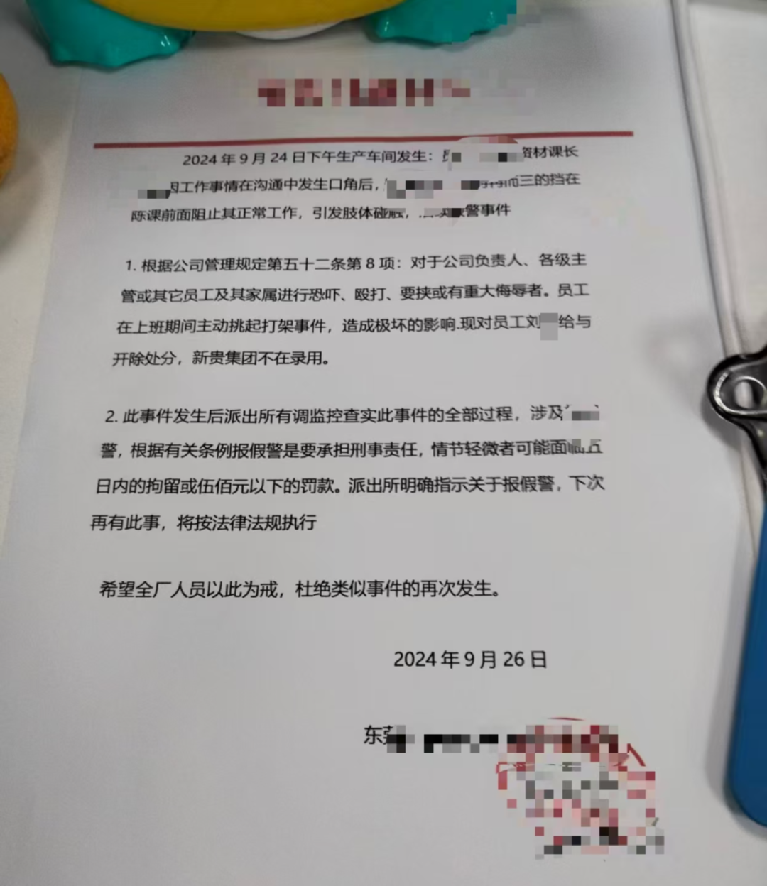 两天后,该公司在生产车间的公告栏内张贴了一份“惩戒”公告。公告称,员工冯涛与课长陈某发生口角后,“一而再再而三的挡在陈课前面阻止其正常工作,引发肢体碰触”,该行为属于“上班期间主动挑起打架事件,造成极坏的影响”,依据公司管理规定,决定对冯涛给予开除处分。公告还提及了报警事件,并称“涉及报假警”,派出所已明确指示若再有此类情况将依法处理。