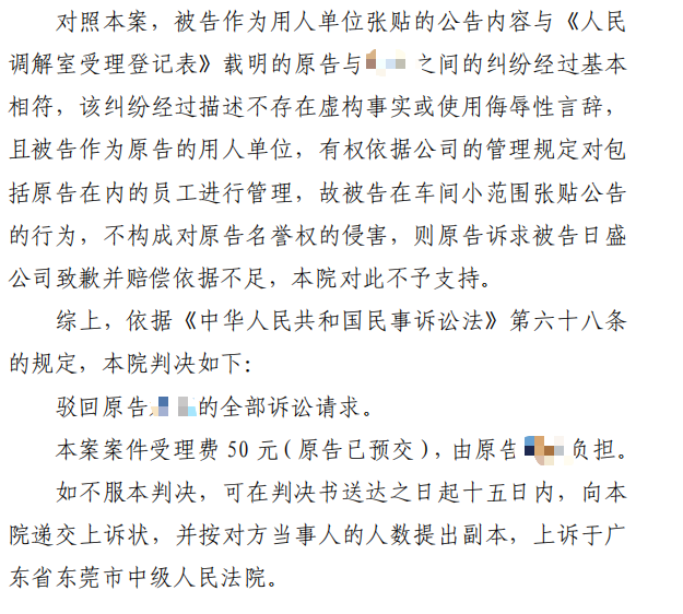 该案中,公司作为用人单位,其张贴的公告内容基本反映了事实经过,不存在虚构事实或使用侮辱性言辞的情况。同时,用人单位有权依据依法制定的规章制度对员工进行管理和必要的惩戒公示,这是企业行使内部管理权的正当方式。公告张贴的范围仅限于公司内部生产车间,旨在规范管理秩序,警示他人,并未超出合理限度。