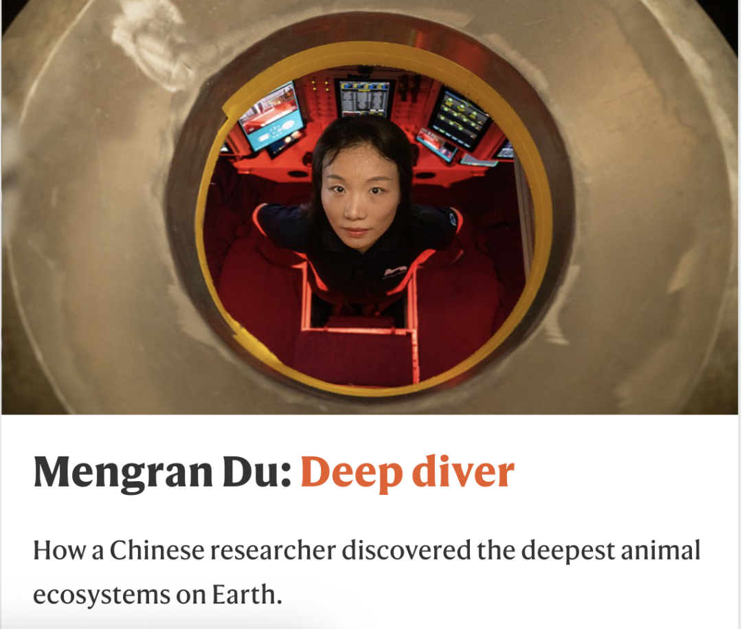 在海平面9000米以下,中国科学院深海科学与工程研究所研究员杜梦然及其团队在2024年的深潜中发现了地球上已知最深的动物生态系统,并于今年发表了相关研究成果。杜梦然被榜单称为“深潜者”,在海洋最底层“见证了科学界前所未有的景象”。