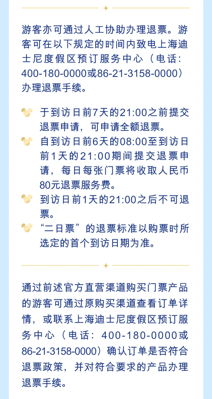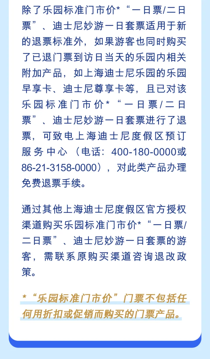 新退票标准为通过前述官方直营渠道购买乐园标准门市价“一日票/二日票”、迪士尼妙游一日套票的游客,于到访日前7天的23:59(含)之前提交退票申请,可申请全额退票;