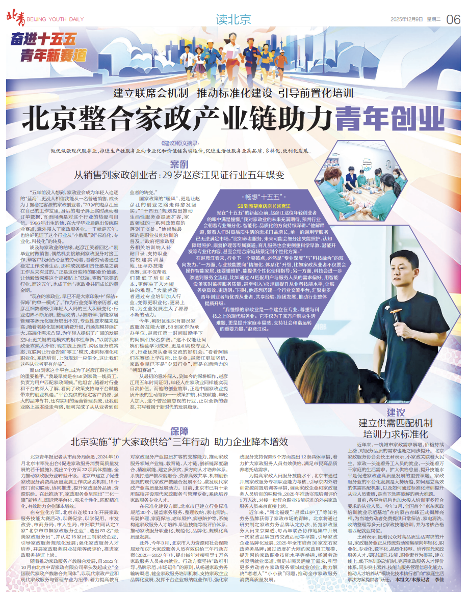站在“十五五”的新起点前,赵彦江这位年轻创业者的眼中满是憧憬,“我对家政业的未来充满期待,预判行业会朝着专业细分化、智能化、品质化的方向持续深耕。”他解释道,随着人们对高品质生活的需求日益增长,单一的通用型服务已无法满足市场。“比如养老服务,未来可能会细分出失能照护、认知障碍照护、康复护理等专属赛道;育儿服务也会更侧重科学早教、潜能开发等专业化内容,甚至会结合家庭场景定制个性化方案。”