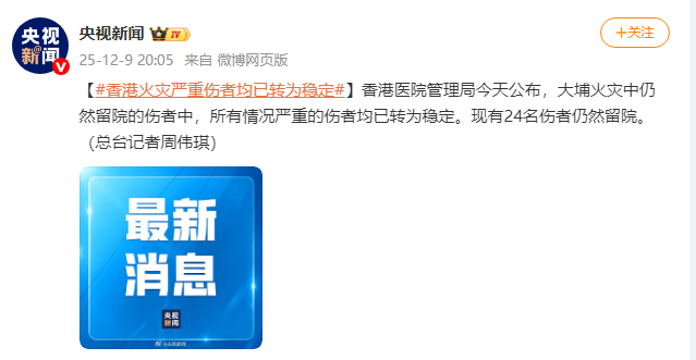 香港医院管理局今天公布,大埔火灾中仍然留院的伤者中,所有情况严重的伤者均已转为稳定。现有24名伤者仍然留院。