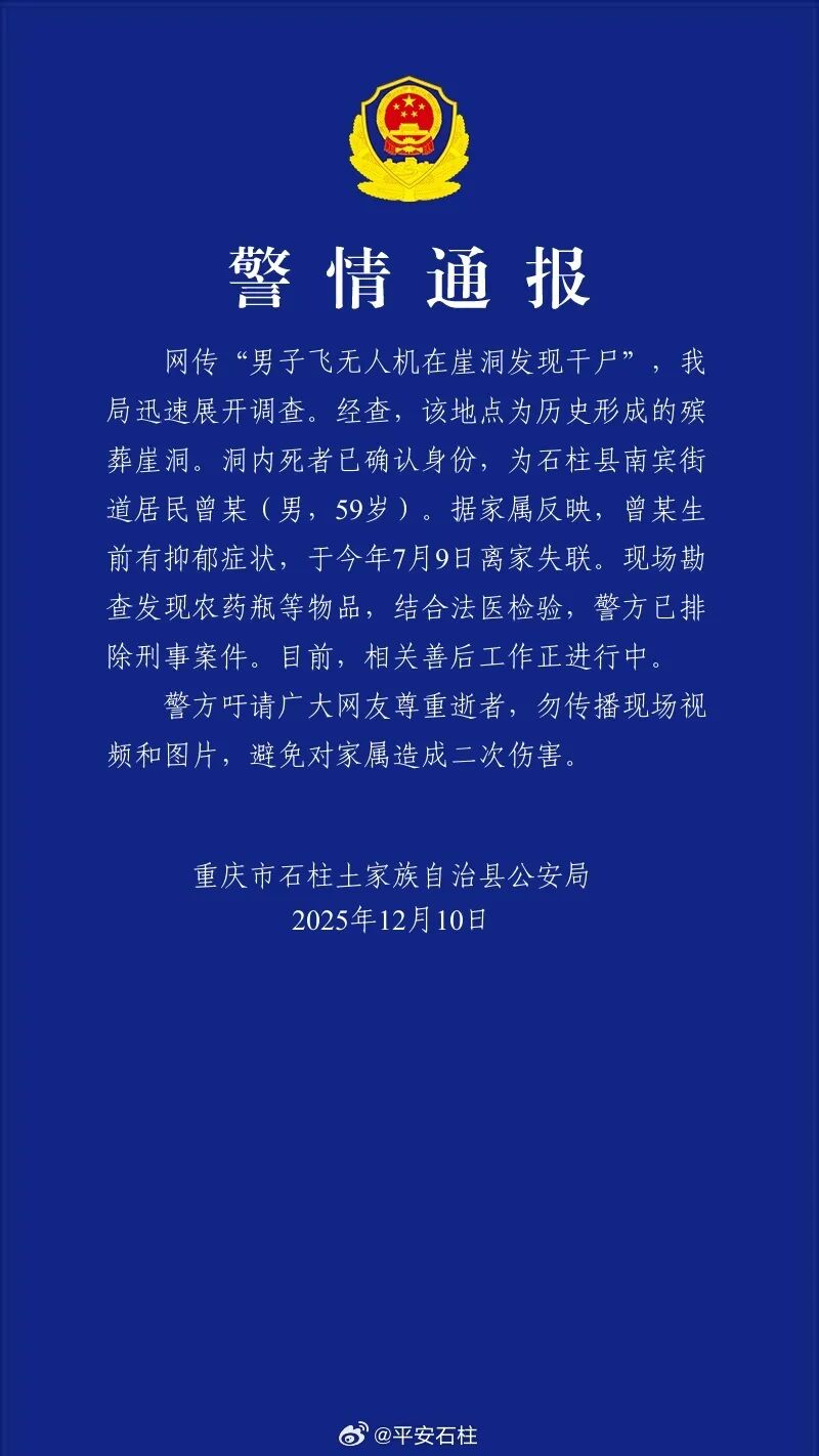 近日,重庆一男子飞无人机时,在一个崖洞中发现干尸。12月10日,重庆市石柱土家族自治县公安局就此事发布警情通报称,经查,该地点为历史形成的殡葬崖洞。洞内死者已确认身份,为石柱县南宾街道居民曾某(男,59岁)。据家属反映,曾某生前有抑郁症状,于今年7月9日离家失联。现场勘查发现农药瓶等物品,结合法医检验,警方已排除刑事案件。目前,相关善后工作正进行中。