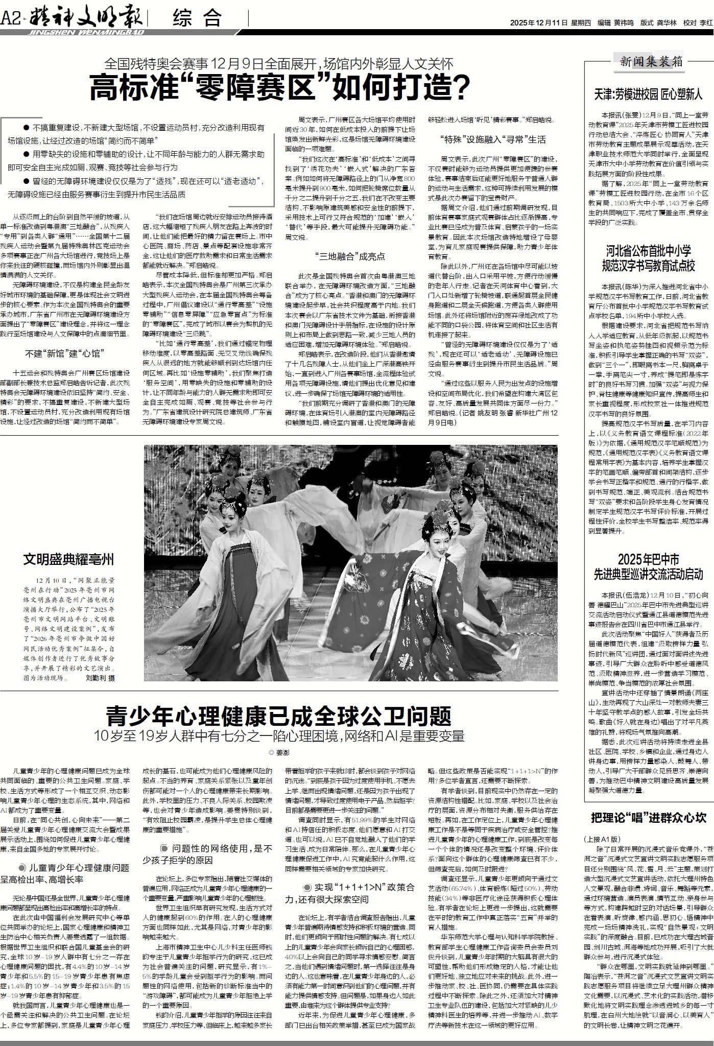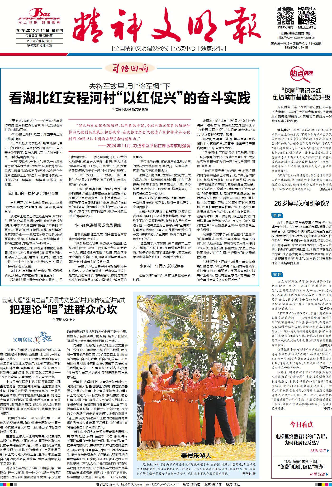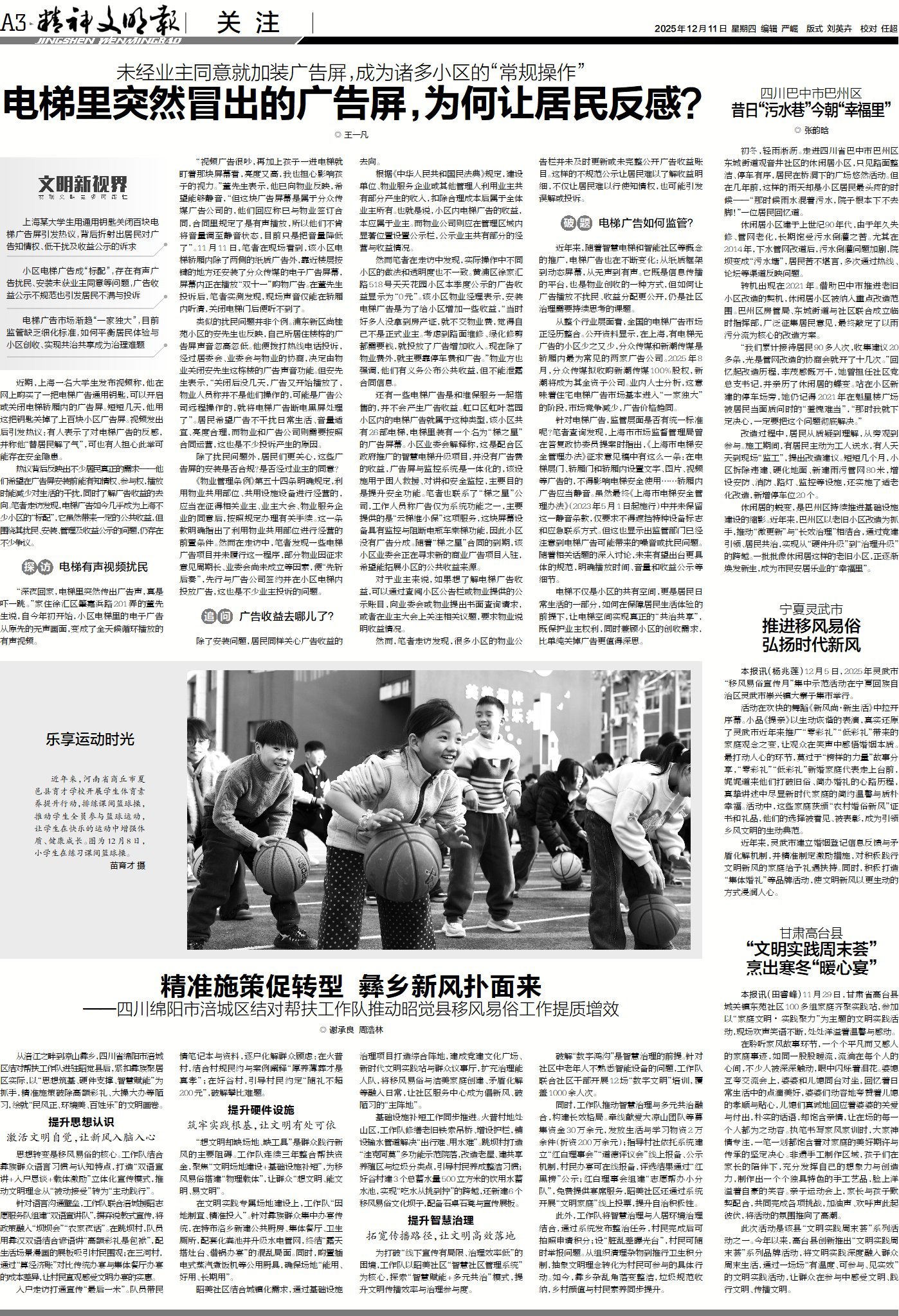 今日版面“早”知道:A1版头条走进将军故里湖北红安程河村,看“以红促兴”的奋斗实践;《热点观察》栏目关注“探厕”笔记如何倒逼城市基础设施升级;聚焦26岁博导引发的争议,是破格创新还是学术浮躁与偏见的交织?A2版“综合”版关注全国残特奥会,高标准“零障赛区”如何打造?A3版《文明新视界》剖析电梯广告背后的民生痛点与治理难题,探寻公共空间“共治共享”的可行路径;A4版“深读”聚焦“免费追剧”背后的隐私危机,别让盗版APP偷走你的隐私!