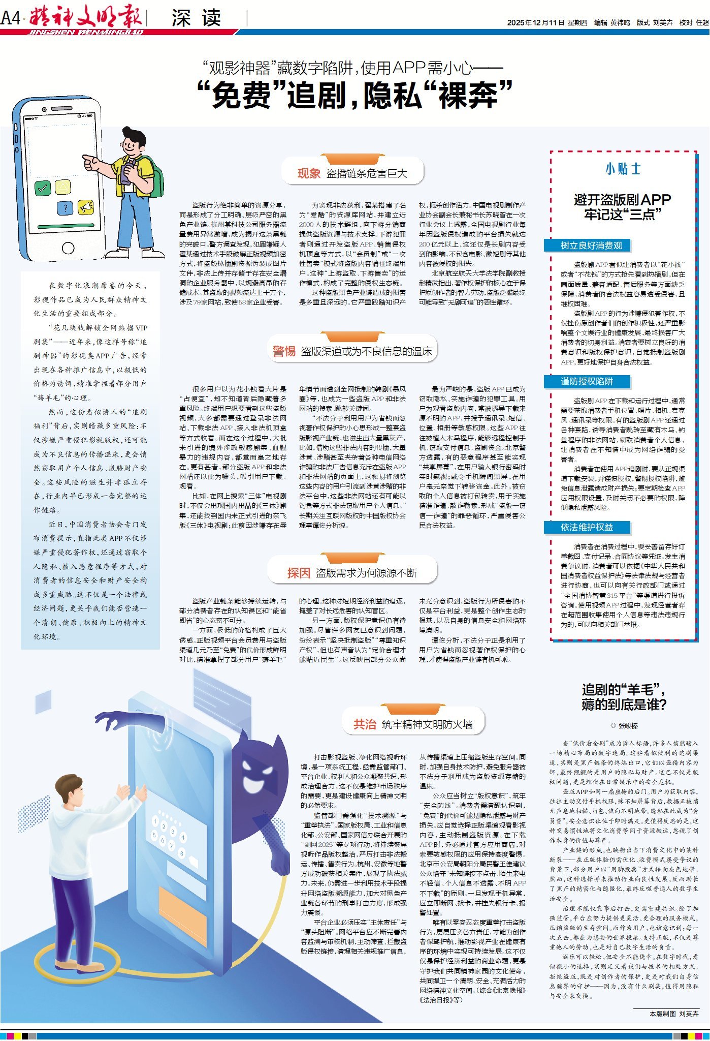 今日深读聚焦“免费追剧”背后的隐私危机。盗版APP看似实惠,实则在窃取个人信息、侵害创作者权益。来,走进今日A4“深读”,了解如何识别风险、保护隐私,树立正确消费观与版权意识。远离盗版,既是对创作的尊重,更是对自身安全的守护。清醒追剧,从选择正版开始。