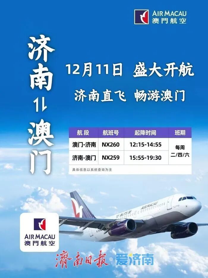 澳门航空济南航线的开通,填补了山东中部直飞澳门的空白,并与现有的青岛⇌澳门航线形成互补,进一步优化了山东省与澳门地区的航空网络布局。澳门航空济南⇌澳门航线每周3班(周二、四、六)。